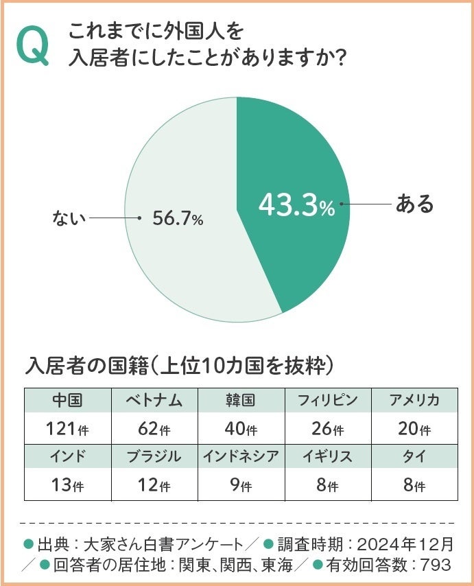「大家さん白書2025」の調査によると、外国人入居経験のある大家さんは43.3%に上り、特に中国(121件)、ベトナム(62件)、韓国(40件)といったアジア圏からの入居が多い傾向が見られました。これは、日本での就労や留学を目的とした外国人の賃貸ニーズが高まっていることを反映しており、空室対策の一環として外国人入居を検討する動きが広がっていることを示唆しています。