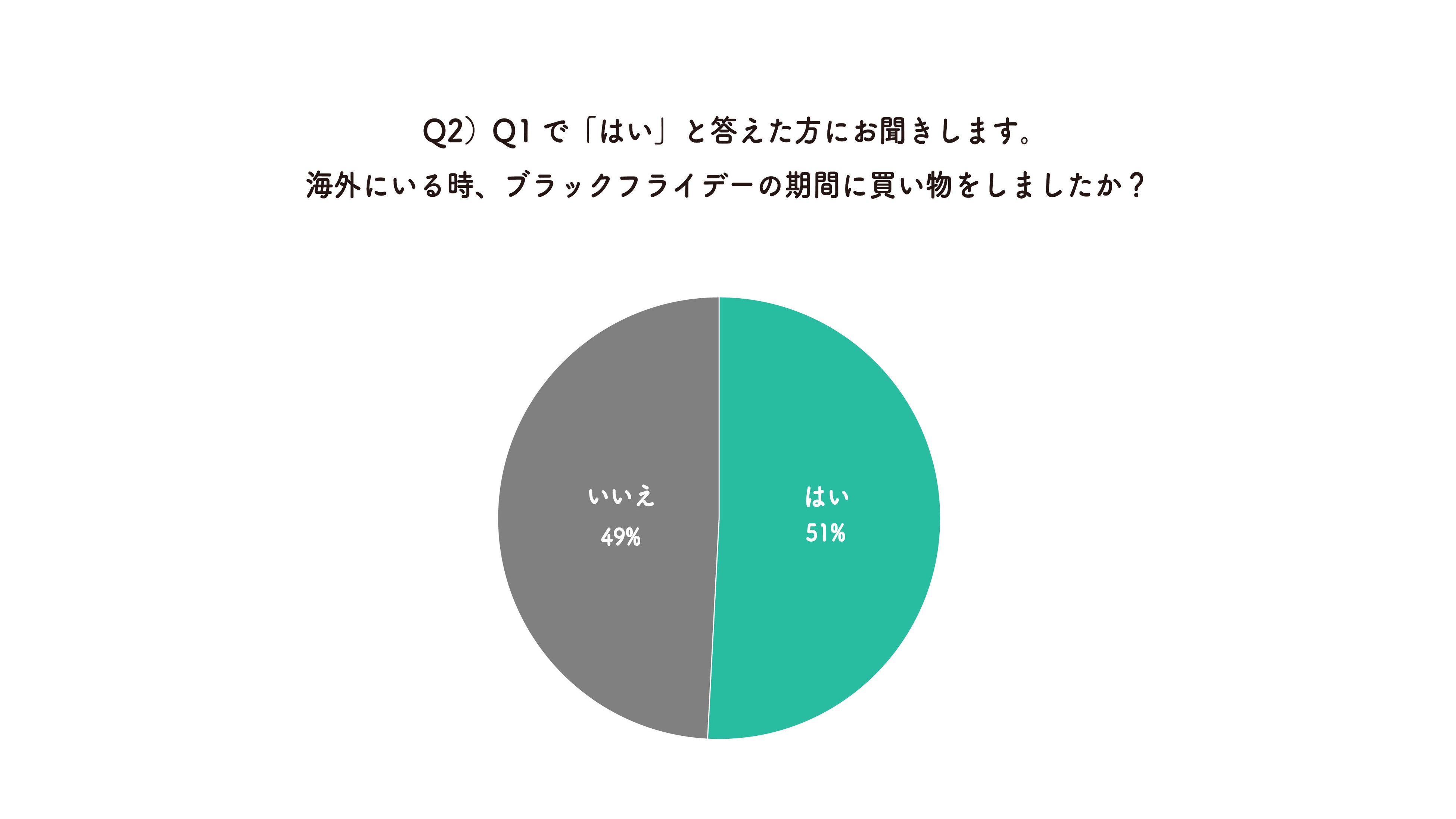 Q1で「はい」と答えた人のうち、2人に1人は「海外でブラックフライデー期間に買い物をしたことがある」と回答しました。海外ではブラックフライデーが一般的なイベントであり、かつ積極的に買い物をする機会として捉えられていると言えそうです。