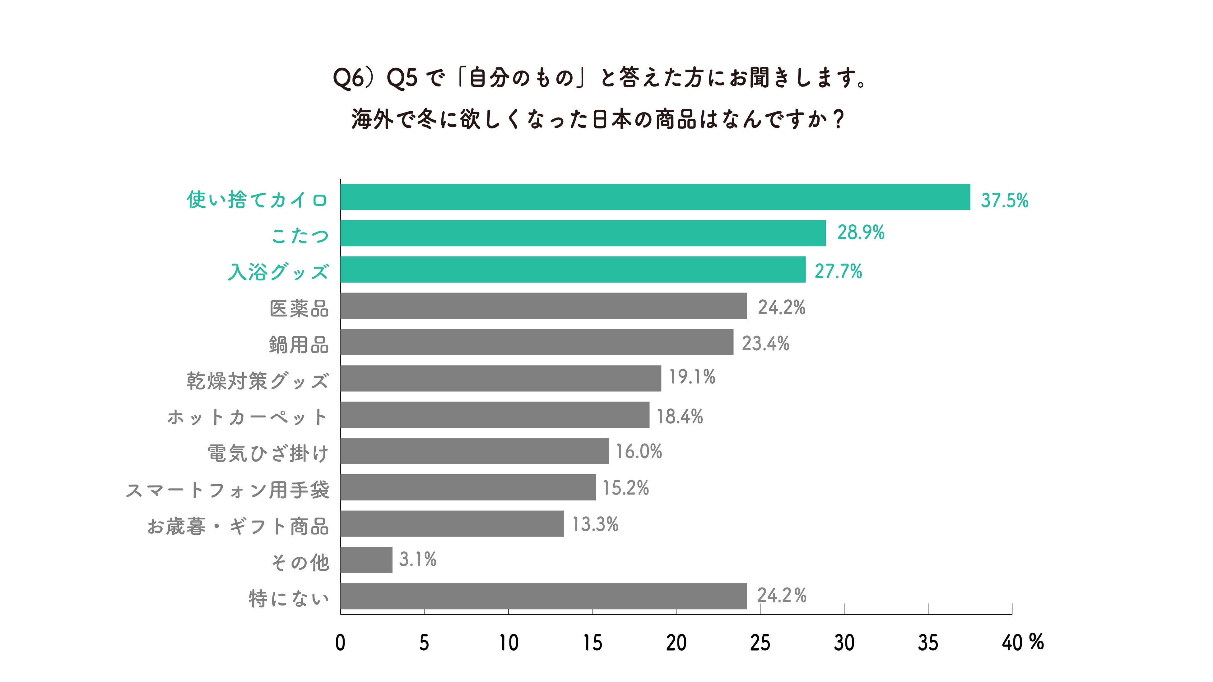 Q5で「自分のもの」と答えた人に「海外で冬に欲しくなった日本の商品」を聞いたところ、1位は「使い捨てカイロ」で37.5%の人が回答しました。使い捨てカイロは回答者の男女を問わず最も高かったため、海外では気軽に手に入らない防寒グッズであると言えそうです。