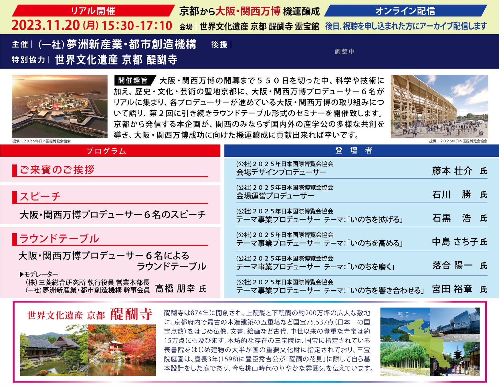 ●日時:2023年11月20日(月) 15:30~17:10 ●会場:世界文化遺産 京都 醍醐寺 霊宝館 ●主催:一般社団法人夢洲新産業・都市創造機構