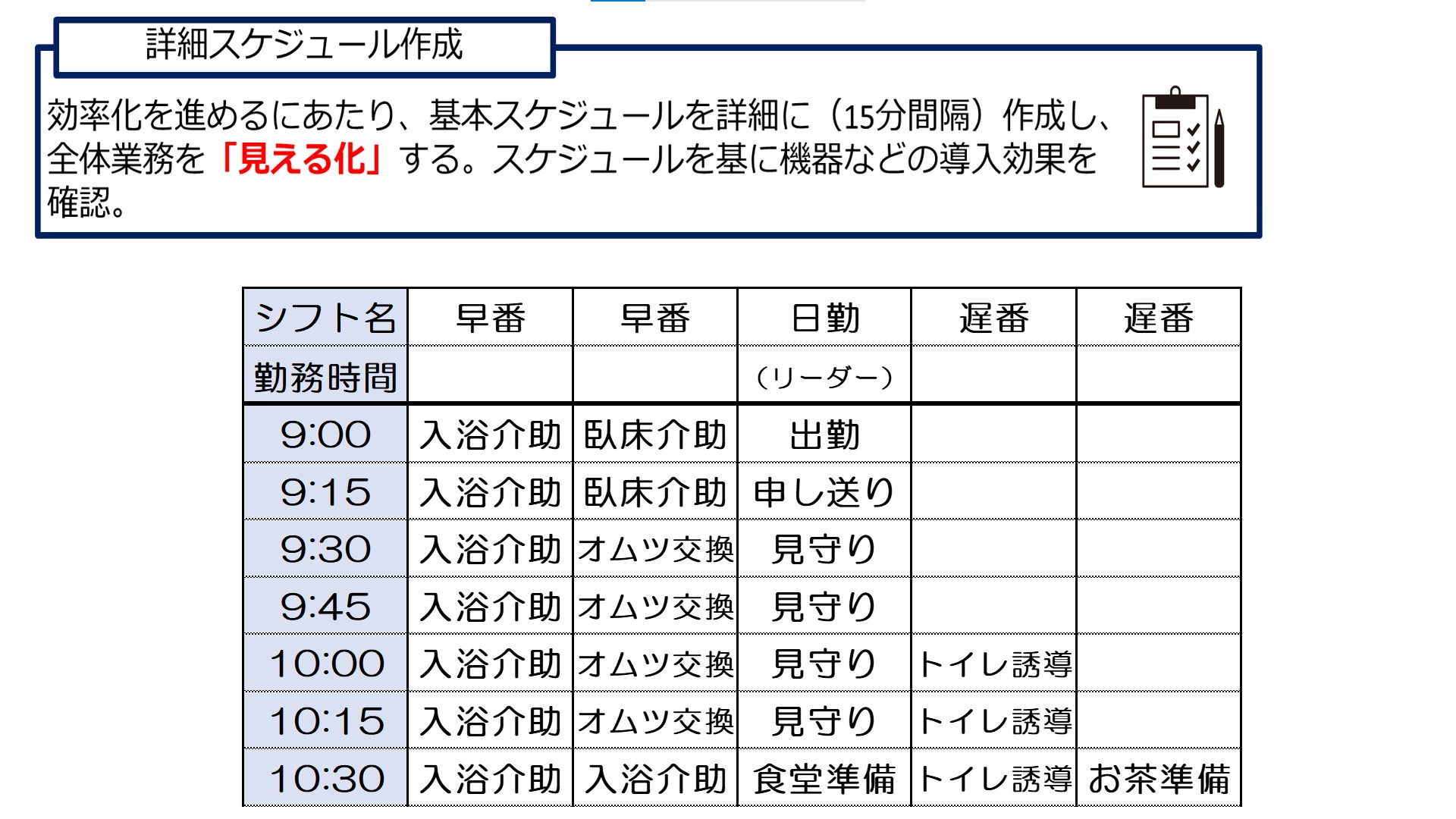 まずは現状把握のため改めて15分間隔でどのシフトがいつ何をしているのか見える化し、「どの業務に時間が多くかかってしまっているのか」、「その業務は夜勤がすべきか、日勤が担うべきか」などを振り返り課題を抽出した。