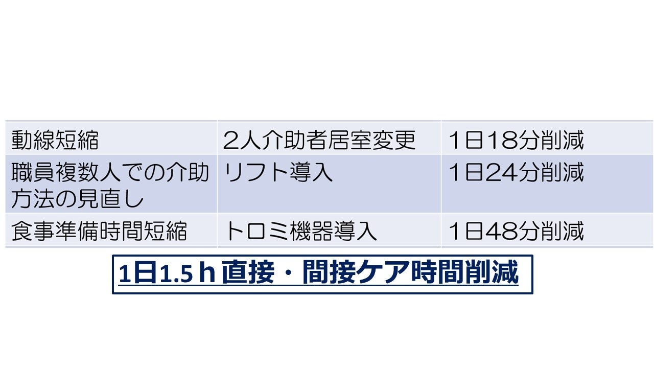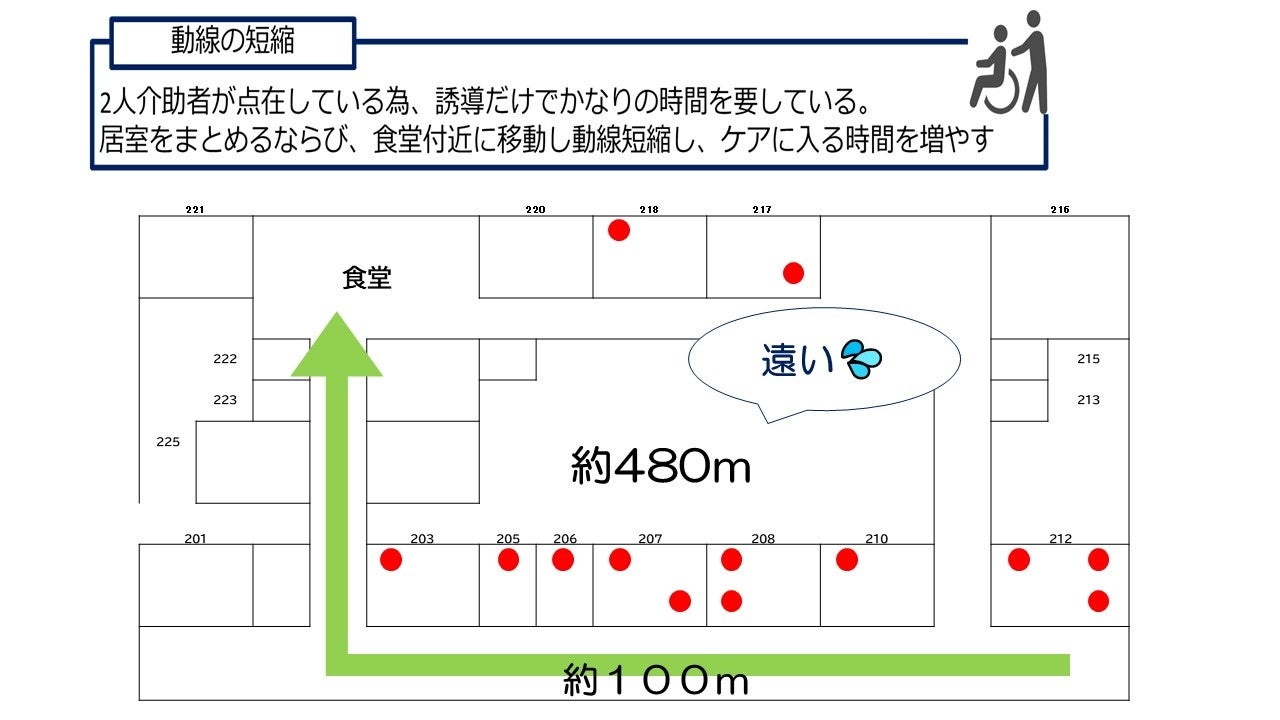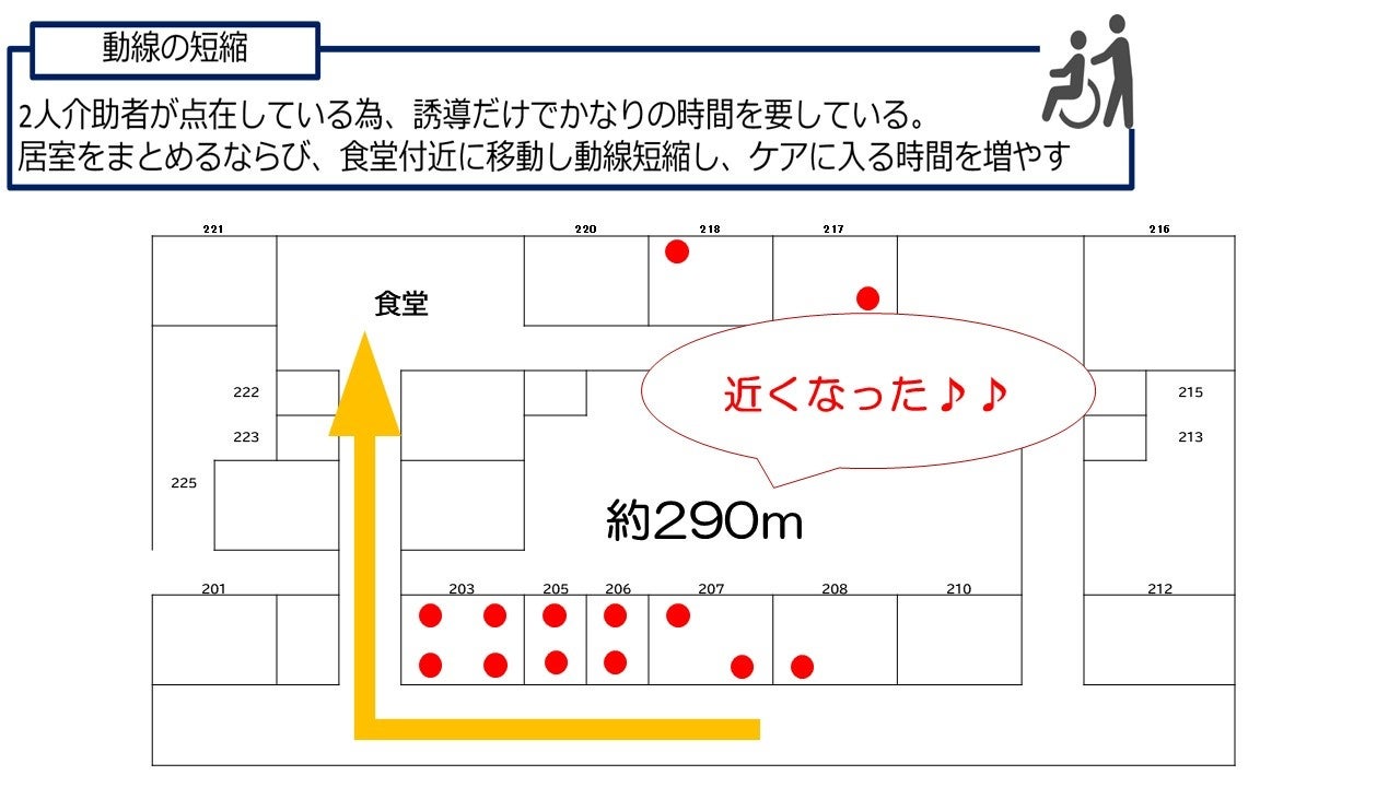 そこで支援が必要な方を食堂に近い居室にお引越しをしていただく取り組みを行った。この動線の工夫により1日18分の削減に繋がった。