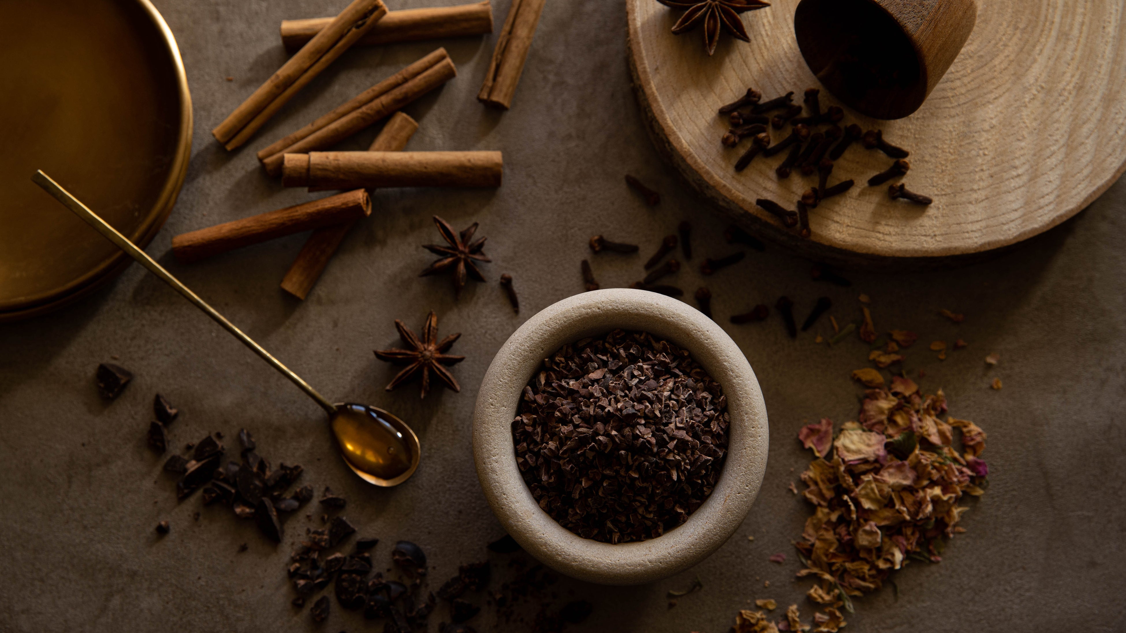 カカオマス、カカオニブ、ローズダマスク、スペアミント、クローブ、八角、コリアンダーシード、クミン、シナモン