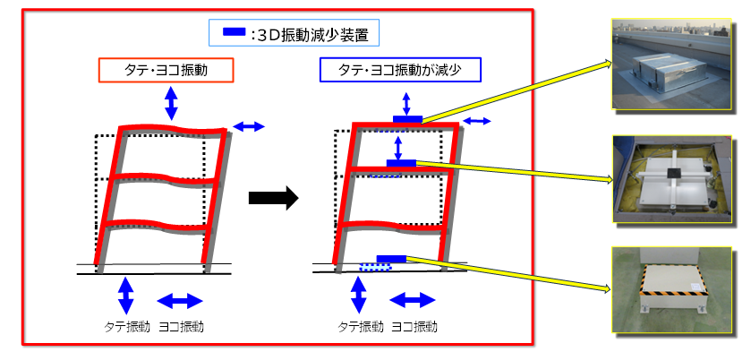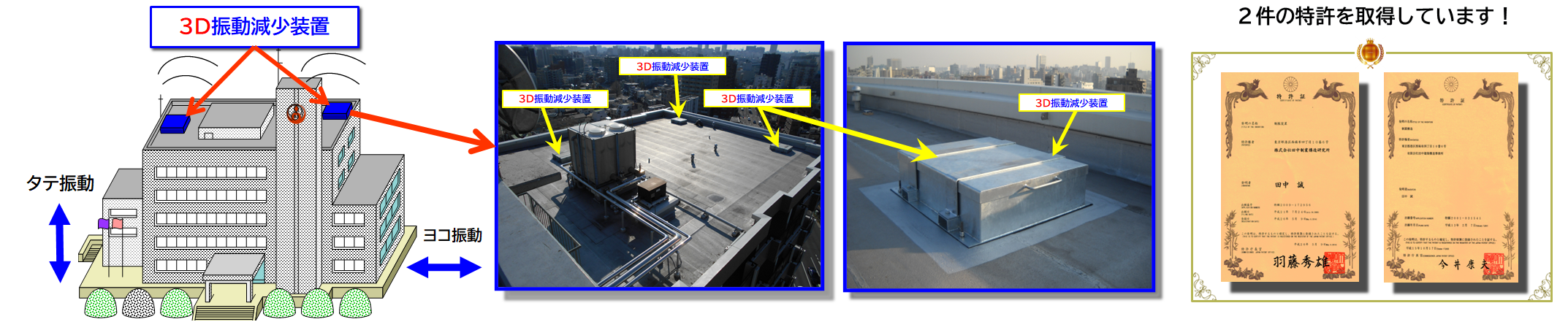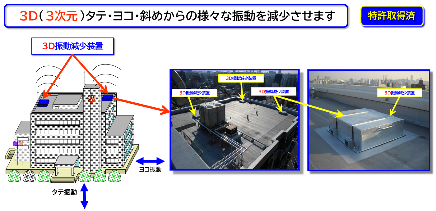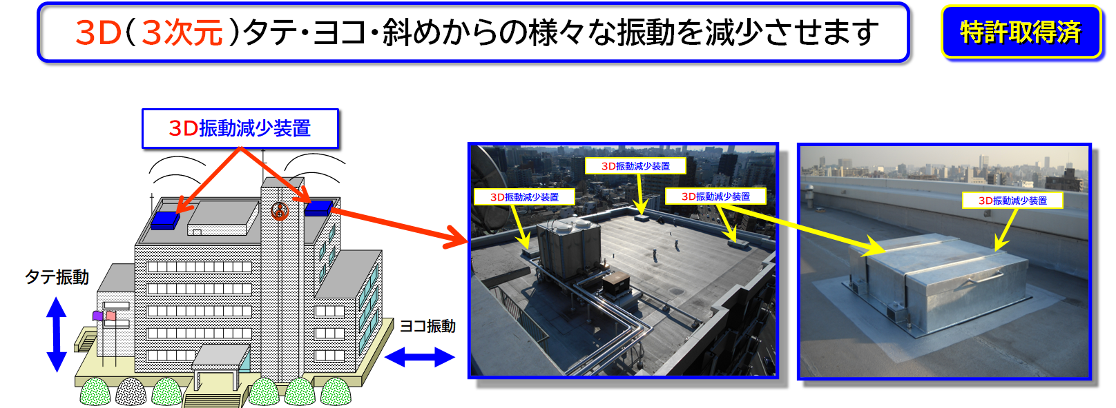 ・特徴 : この「3D振動減少装置」は、設置した建物と一体化する新技術により、常時、大きな振動減少効果を様々な分野で発揮して、有害な振動を大幅に減少させることが出来ます。同時に、高精度振動減少予測解析システムを稼働しました。