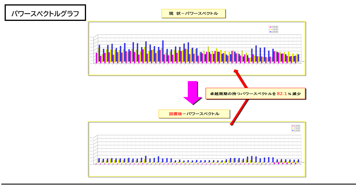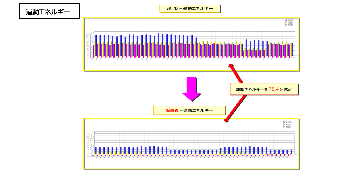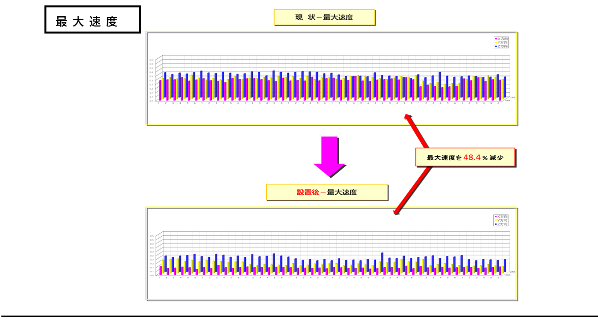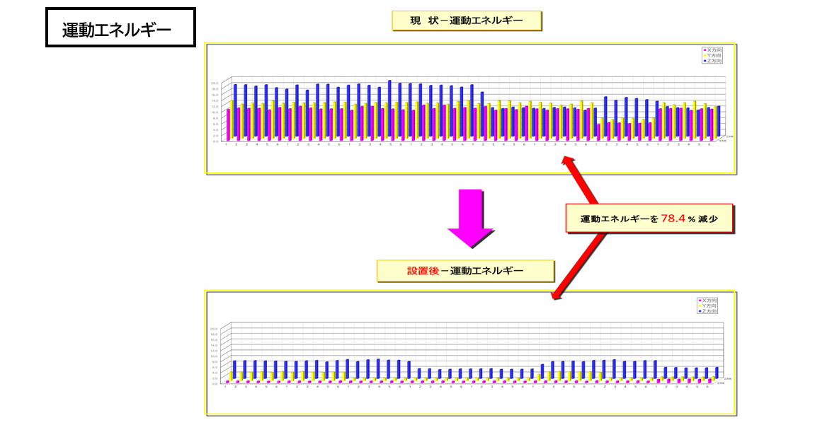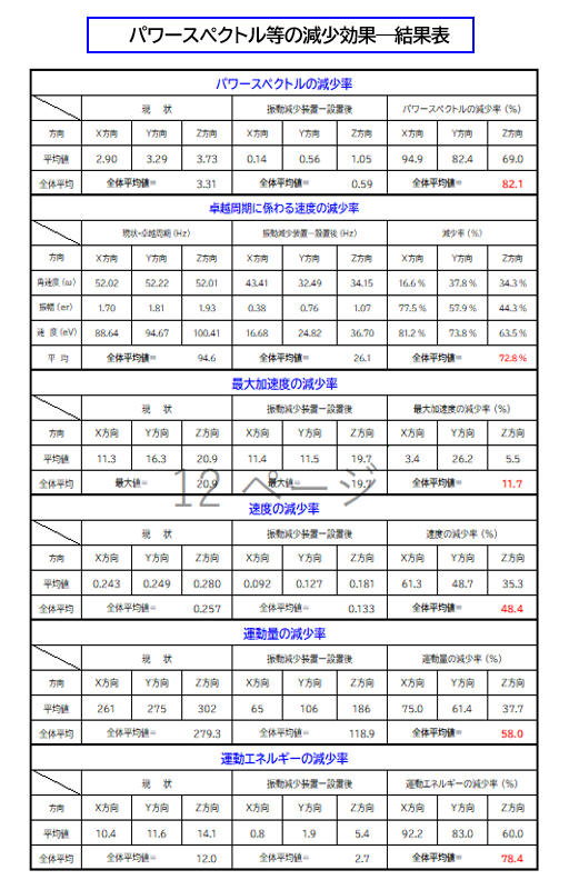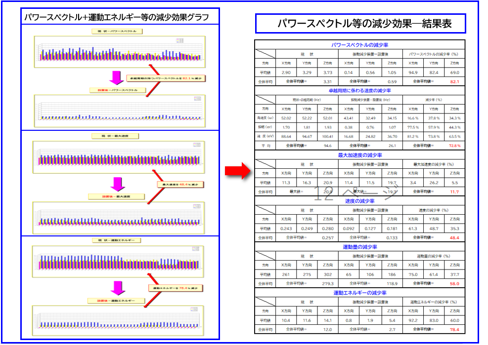 下記のパワースペクトル・最大加速度・速度・運動エネルギー等のグラフにおいても、大きな減少効果が実証されました。