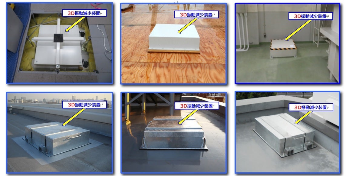 「3D振動減少装置」は、既に多くの建物や施設に採用され、振動減少効果を実証しています。一般に建物等に採用される振動減少装置(制振装置)は、振動を低減するための重りの役割を果たすため、その建物全重量の数%以上に設定され、少なくとも数トン~数十トンを超える重量と、高さxタテxヨコが共に数メートルを超える大きなサイズが必要となります。また、全方向からの振動には対応出来ません。それに対し、「3D振動減少装置」は重さ=0.3~0.5トン 程度、高さ=30cm、タテ x ヨコ=1mx 1m程度の非常にコンパクト・軽量化を実現し、同時に、一般の大型振動減少装置を上回る振動減少効果を全方向に対して発揮します。この装置の能力とは、建物自体を、設置した「3D振動減少装置」と一体化させる新技術により可能となったものです。