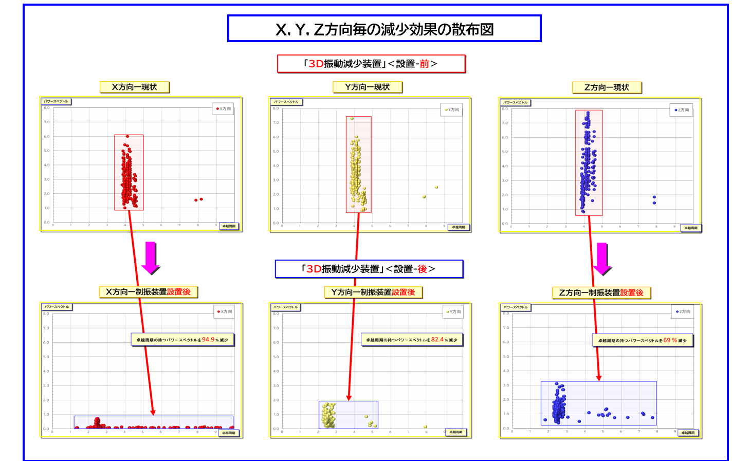「3D振動減少装置」の設置前・後での揺れの強さ(ピーク値)を示す点の集合が、大きく減少していることが実証されました。