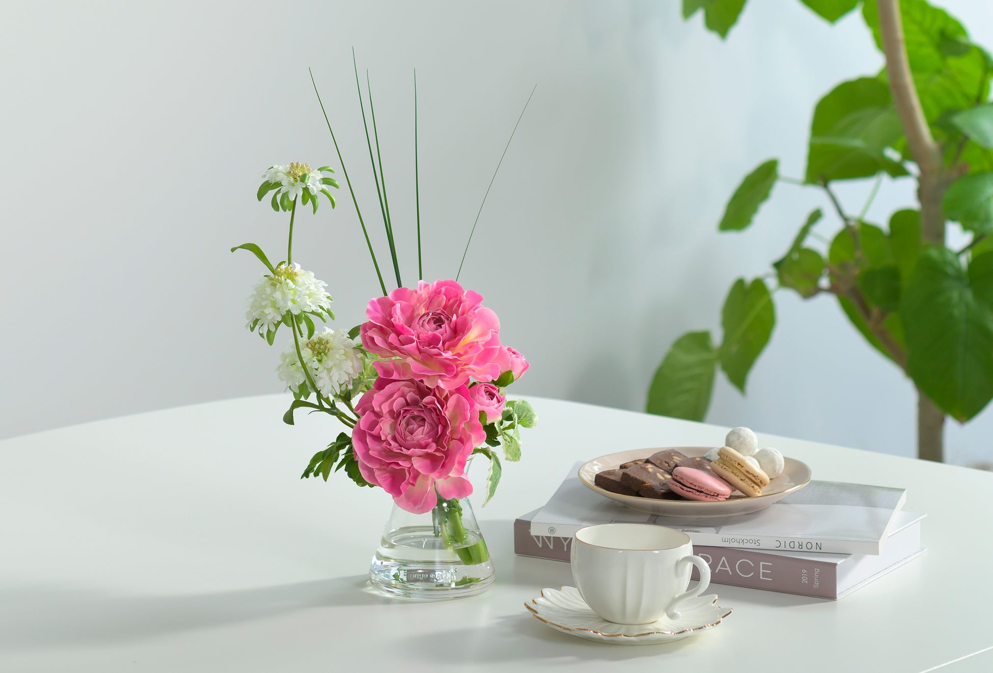 母の日限定商品のラナンキュラスは上品で可憐なアレンジメントで、毎年販売開始とともにすぐに完売してしまう大人気商品です。毎年デザインが変わるためコレクションされる方も多く、色鮮やかなビタミンカラーにミントグリーンのまろやかなアクセントが調和するデザインです。花器の中には水に見立てた透明のシリコン樹脂を注ぎ、よりリアルに花の自然な姿を表現。ラナンキュラスの可憐で華やかさを生かしたアレンジメントは、空間を鮮やかに彩ります。