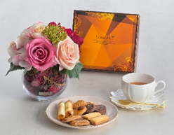 洋菓子店「ロイスダール」のクッキー詰め合わせ(6種14個入)とエミリオ・ロバの「ローズポプリアレンジSS-lp」の特別セット。大小さまざまな花々をピンクグラデーションでまとめ、花器の中には香りのついたポプリが入って、見た目も香りも楽しめるアレンジメントです。