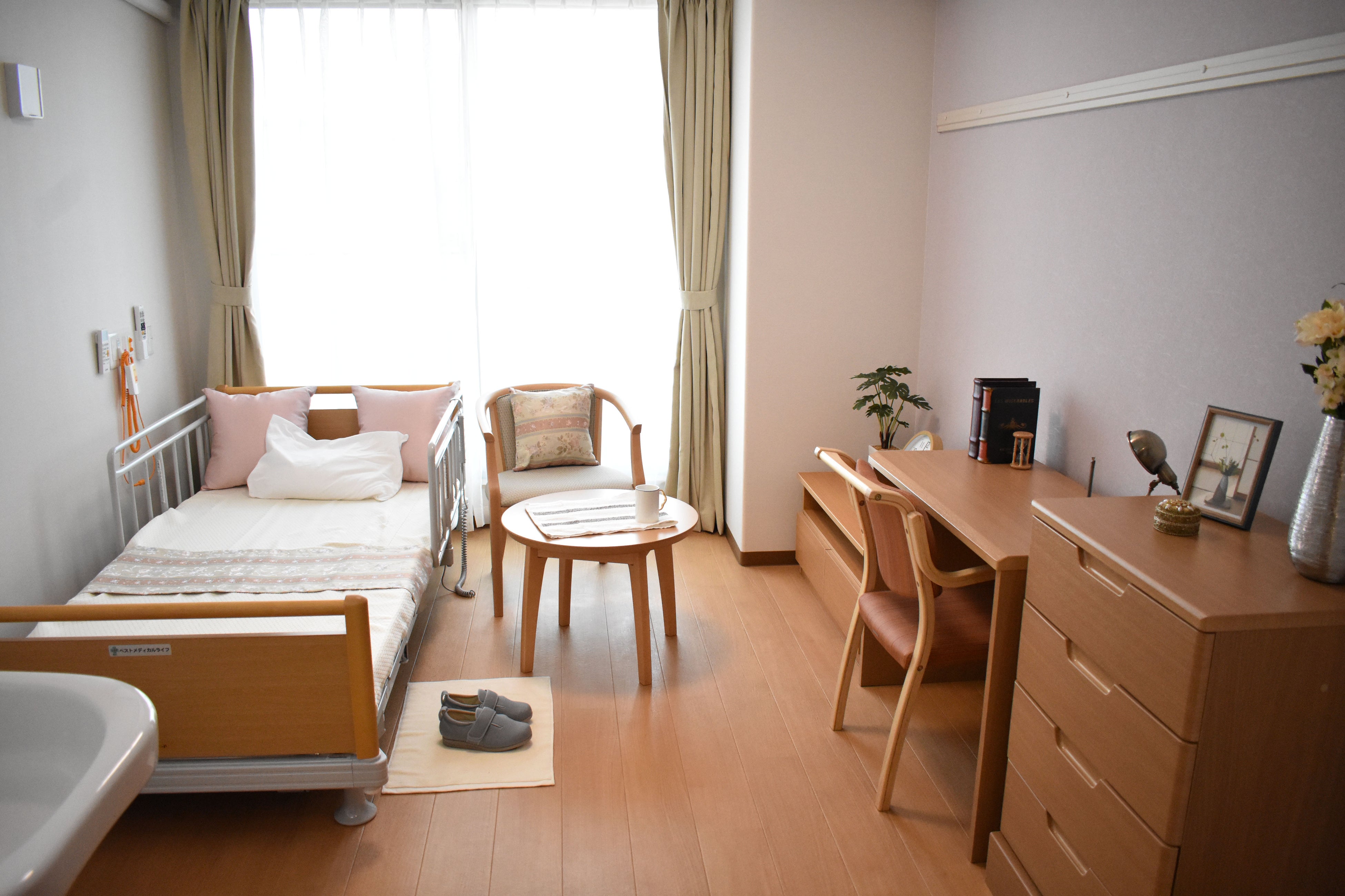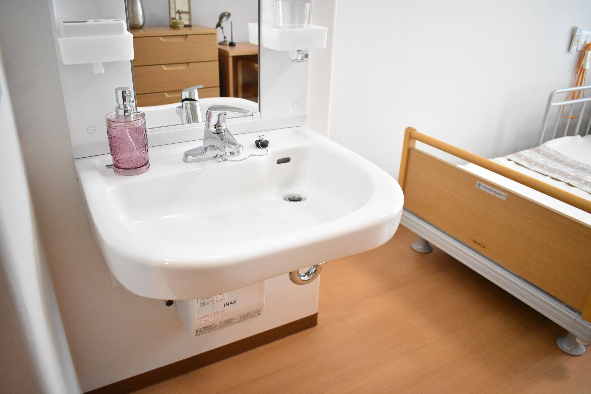 全てのお部屋が、お一人おひとりのプライバシーに配慮した個室(ワンルームタイプ)で、緊急コールやスプリンクラーといった高齢者の安全をお守りする設備はもちろん、介護専用電動ベッドや手元で温水を操作できる車いす対応の洗面台をはじめとする、快適な生活を実現するためのさまざまな設備を整えています。