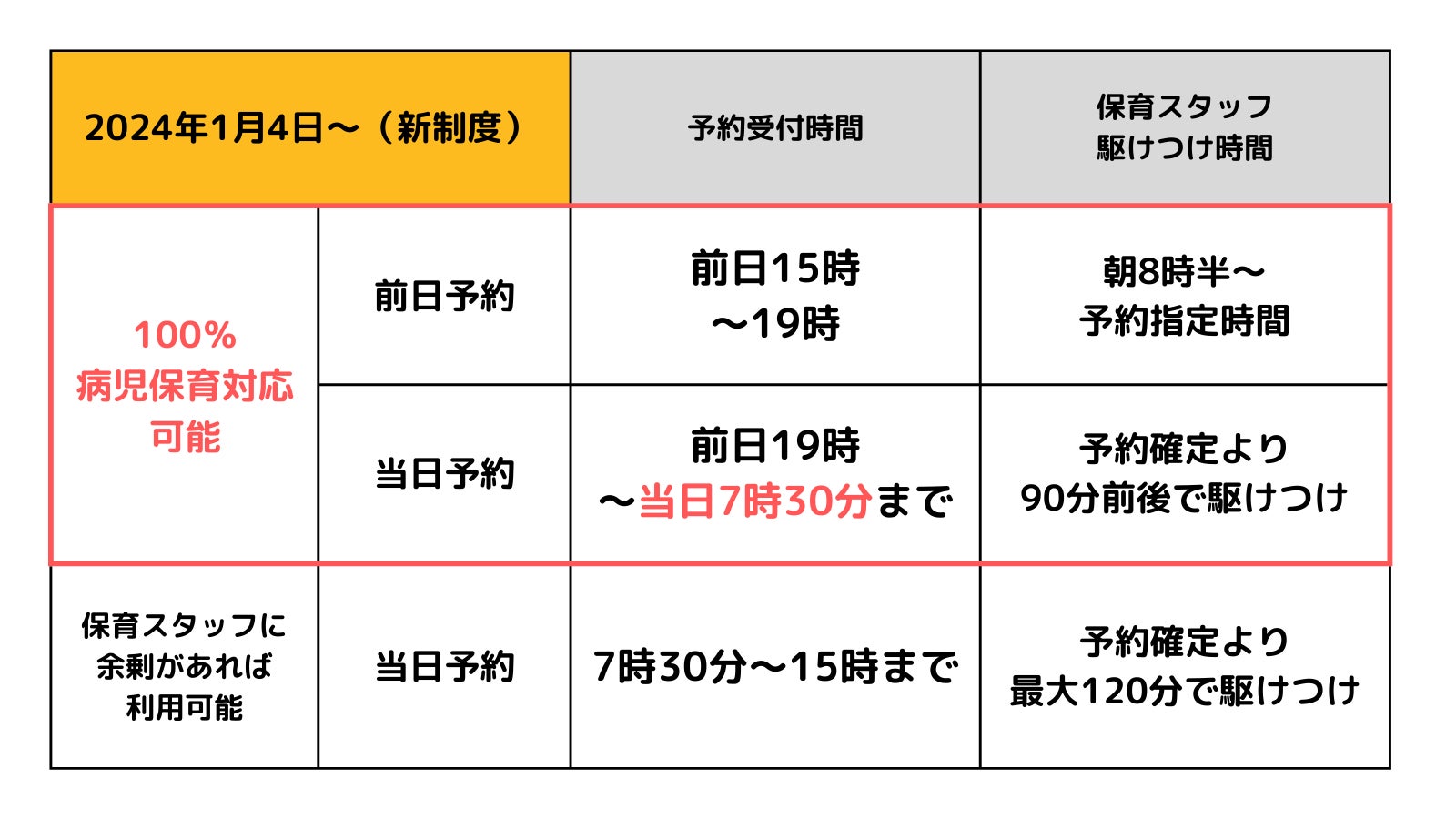そこで2024年1月4日から利用前日15時~当日朝7時30分までのご予約に対して、保育スタッフの体制確保を行い、病児保育を100%対応いたします。