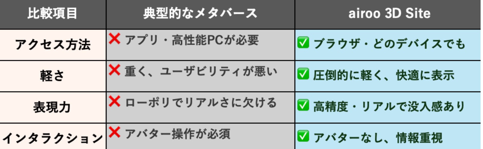 あらゆるデバイスのブラウザから簡単にアクセスできる、高精度な3D Web空間「3D Site」を展開するairoo合同会社(https://airoo.jp)は、2025年5月に3D空間の更なる軽量化、より自然で直感的な操作を実現するためのUIの改良など、3D Siteの操作性と実用性をさらに高める取り組みを進めています。また、ユーザーが操作せずとも空間内を自動で移動できる「自動移動モード」の実装も新たに行い、体験の幅をますます広げています。