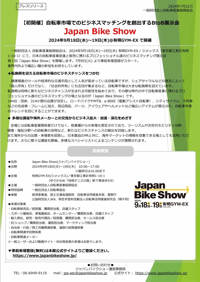一般財団法人自転車産業振興協会は有明GYM-EX / ジメックスにて、日本の自転車産業促進と販売に携わるプロフェッショナル達のビジネスマッチング展示会、第1回「Japan Bike Show」を開催します。