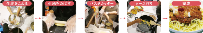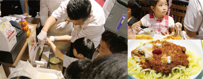 総勢24名のこども達がイベントに参加しました。こども達は、小麦粉から生地をこねてのばし、パスタカッターで切る工程を行い、また、ソース作りでは、シェフ秘伝の味を加え、本格パスタを作り上げました。さらに、完成した商品は、ボランティアの方々や、スタッフへ販売し、こどもマネー(※疑似通貨)を獲得できるというリアルな商売体験も体感しました。