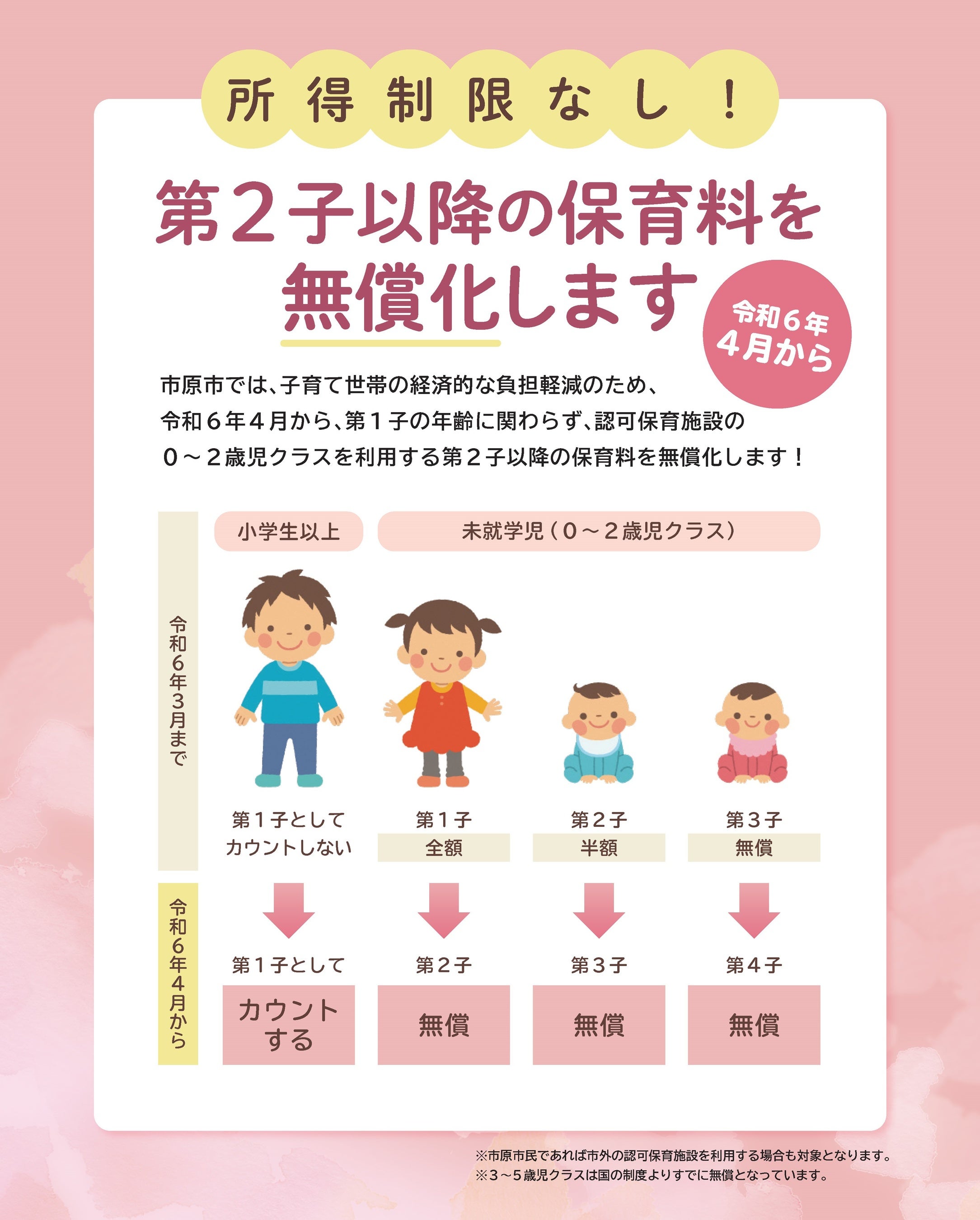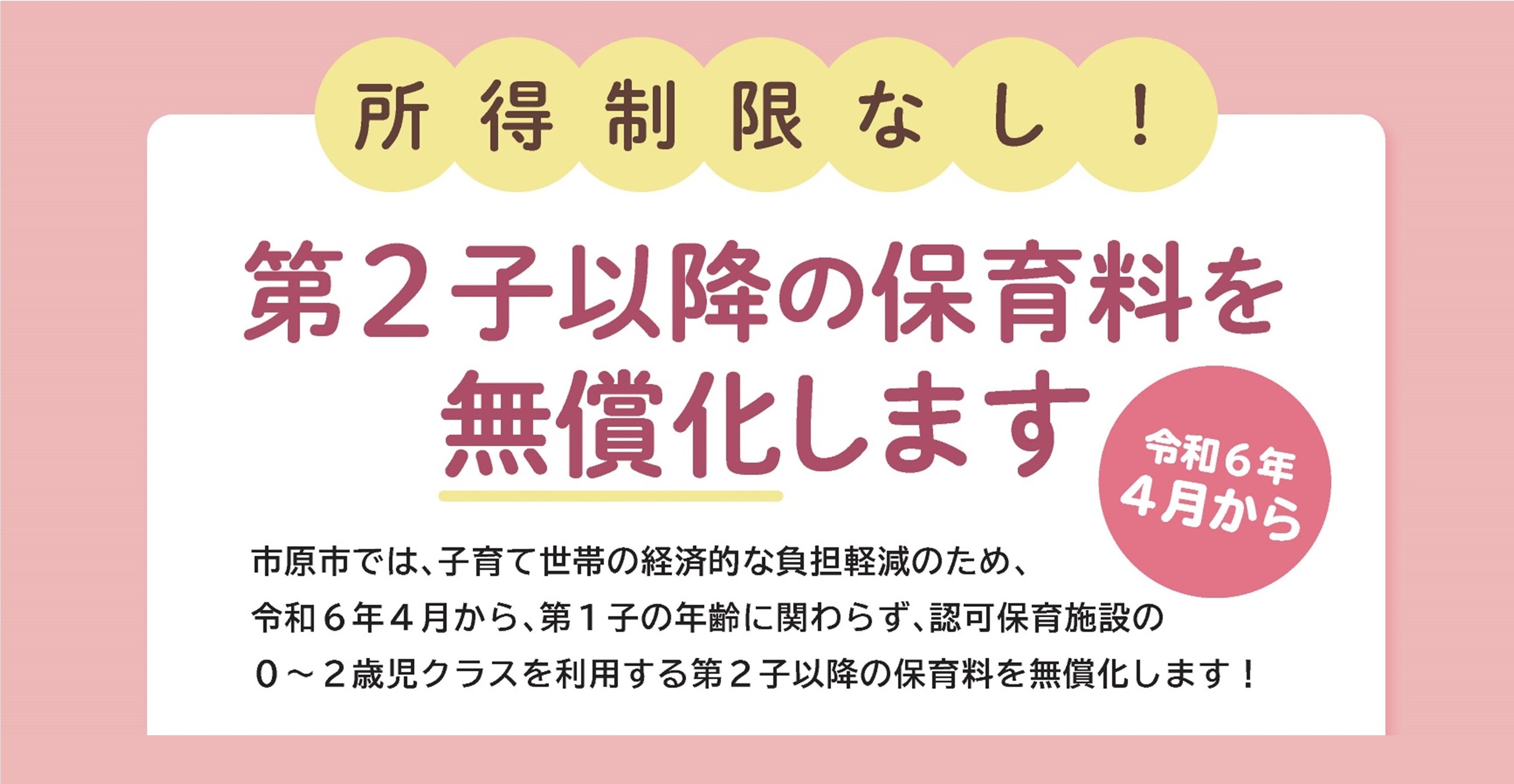 市原市は、子育て世帯の経済的な負担軽減を図り、子どもを産み育てやすい環境づくりを推進するため、令和6年4月から、第1子の年齢に関わらず、認可保育施設の0~2歳児クラスを利用する第2子以降の保育料を無償化します。
