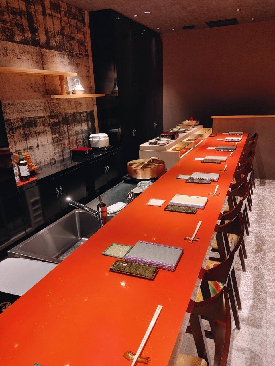 圧巻の朱色の大きなカウンターは、オープン当初から好評で、店内へ入った瞬間に、プライベート空間へいざないます。