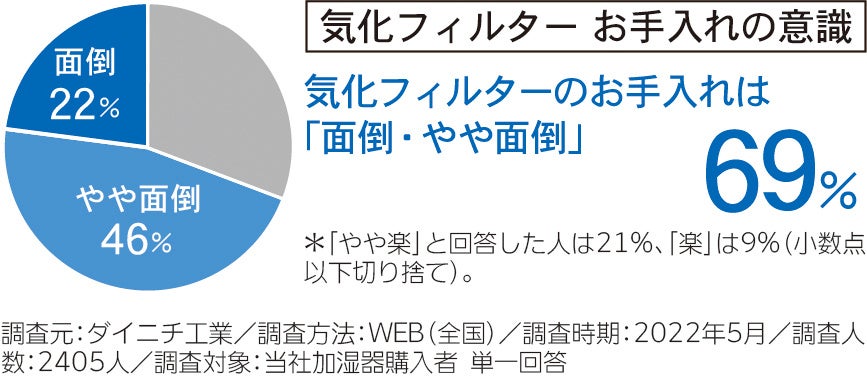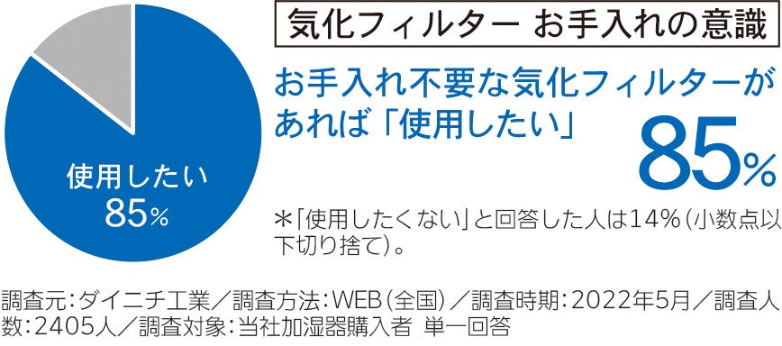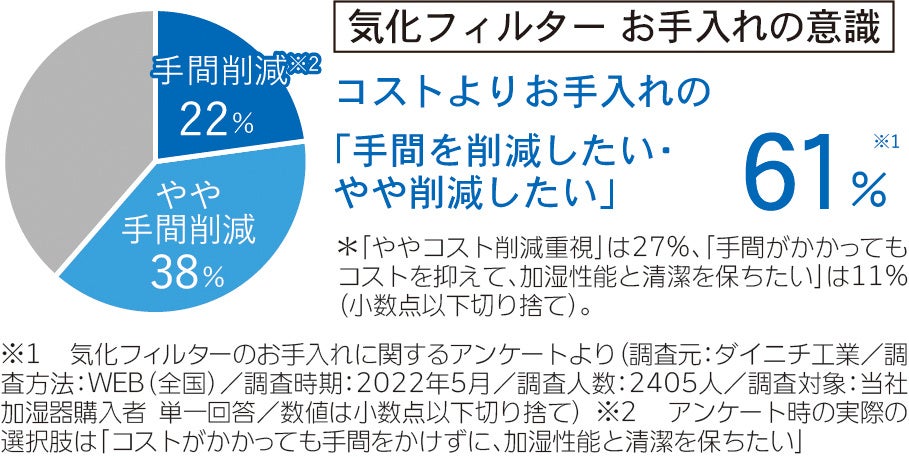 ※1 気化フィルターのお手入れに関するアンケートより(調査元:ダイニチ工業/調査方法:WEB(全国)/調査時期:2022年5月/調査人数:2405人/調査対象:当社加湿器購入者 単一回答/数値は小数点以下切り捨て) ※2 アンケート時の実際の選択肢は「コストがかかっても手間をかけずに、加湿性能と清潔を保ちたい」