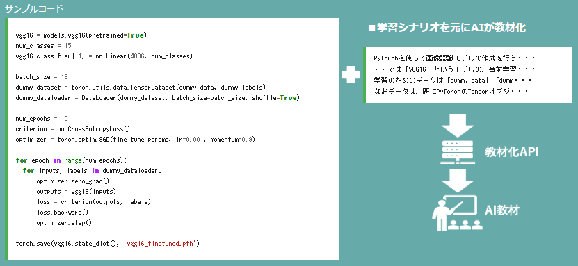 一般的なライブラリを使った通常のPythonコードは、ソースコードをそのまま教材化が可能なほか、企業内の独自ライブラリなど特殊なコードも、コメントを付ければAIがそれを認識し、教材化できます。