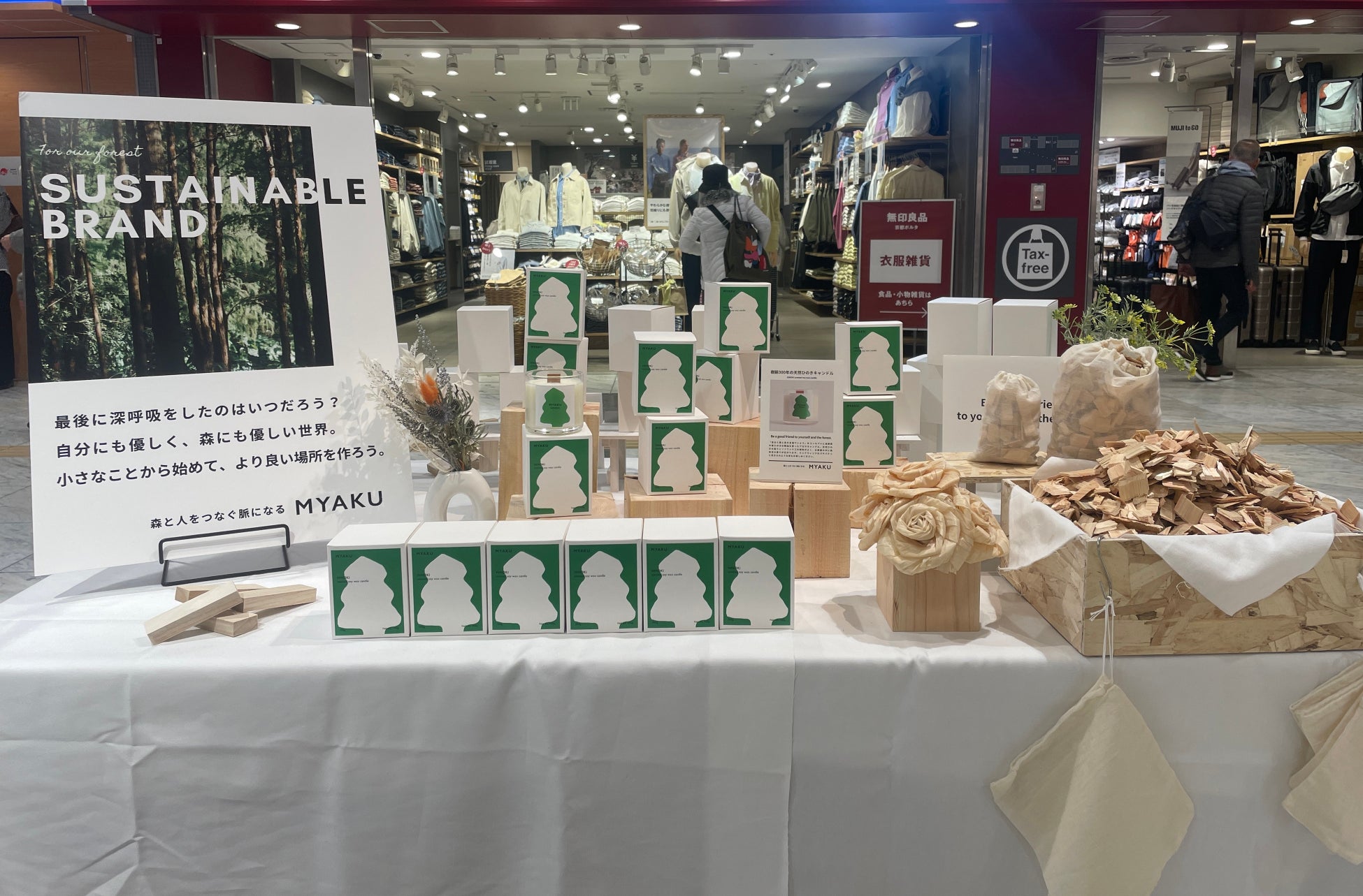 サステナブルブランドMYAKUは「森からはじまる愛おしい暮らし」をコンセプトに、1人時間に癒やしを届ける「樹齢300年の天然ひのきキャンドル」、お部屋に檜の香りを届ける「ひのきウッドチップ」、自宅で檜風呂を楽しめる「ひのき入浴剤」をPOP UP ストアにて展開しました。