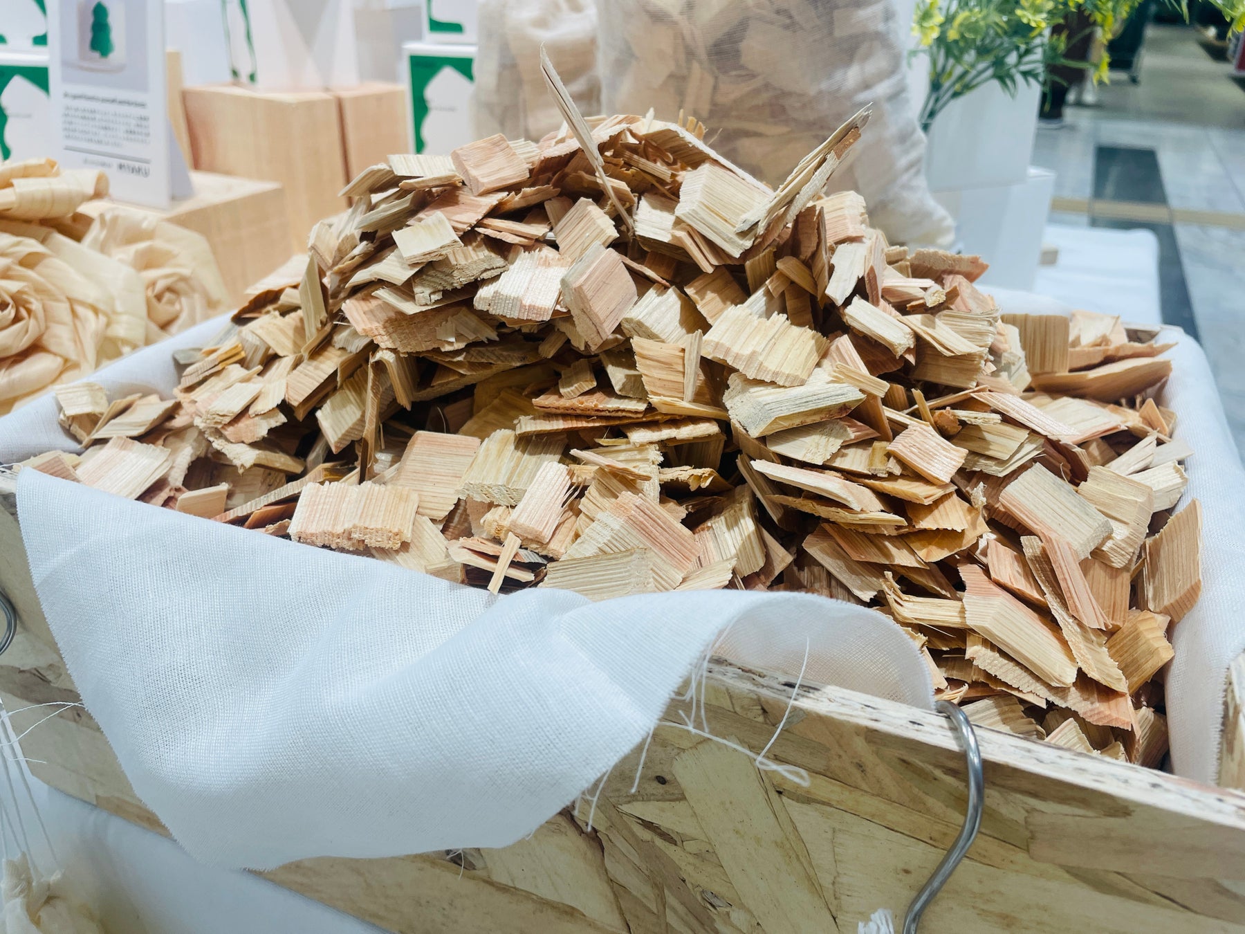 来場者の多くの方が店舗の前を通りかかった際にひのきの香りに気付き、足を止めて頂きました。天然ひのきキャンドルの森林浴の香りを実際に嗅いで楽しんでいただく方や、数日前に切ったばかりのウッドチップを手にとって楽しまれている方が多くいらっしゃいました。「久しぶりにひのきの香りを嗅いだ!いい香り」というお声や、「キャンドルの自然な香りに癒やされる」と、施設内にいながら森の自然な香りを楽しんで頂きました。