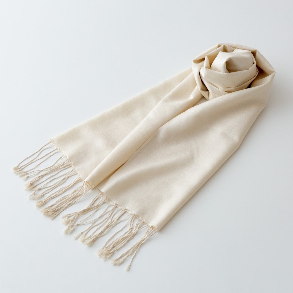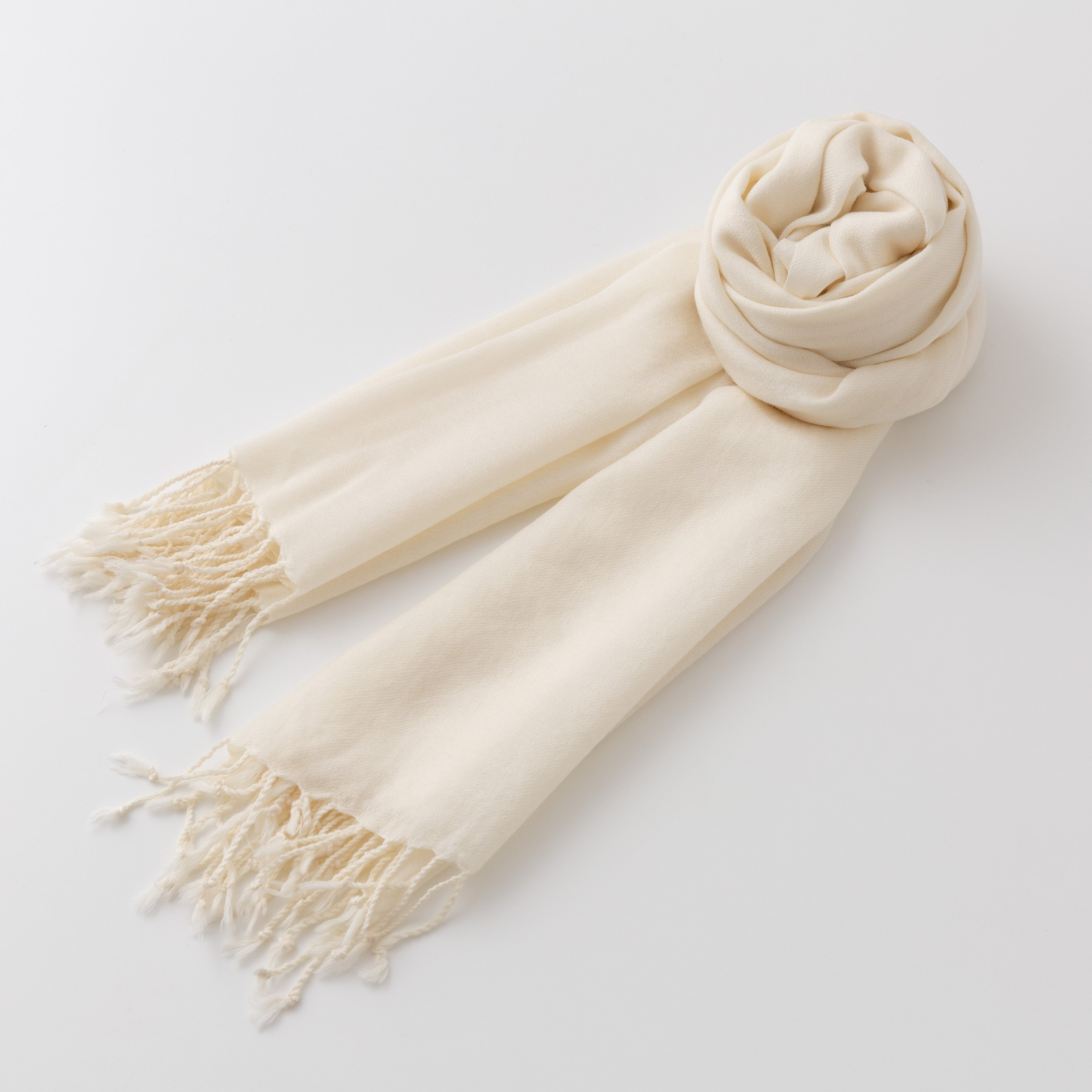 なめらかで触り心地よく、さらっと身に着けられるウール100%ストール。ウールならではの抜群の保温性が、冬の寒さから首元を守ってくれます。また、少し黄味の入った色味はお顔周りに暖かい印象を与えてくれます。