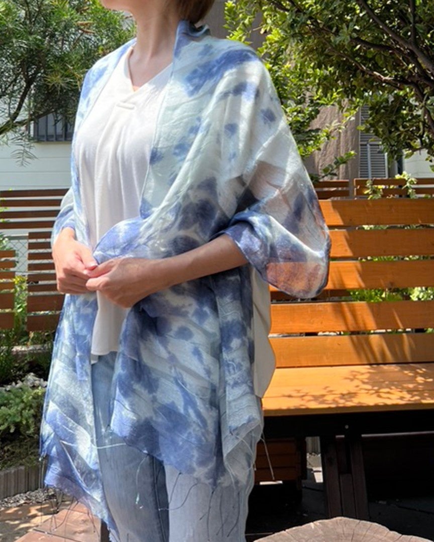 天然素材を中心に柔らかく織り上げた生地を、藍独特の深い色合いで染め上げた美しいストール。素材特有の光沢感と柔らかな肌触りが特徴の一つ。また、比較的静電気に強いレーヨン素材が含まれており、冬場でも安心して着用いただけます。