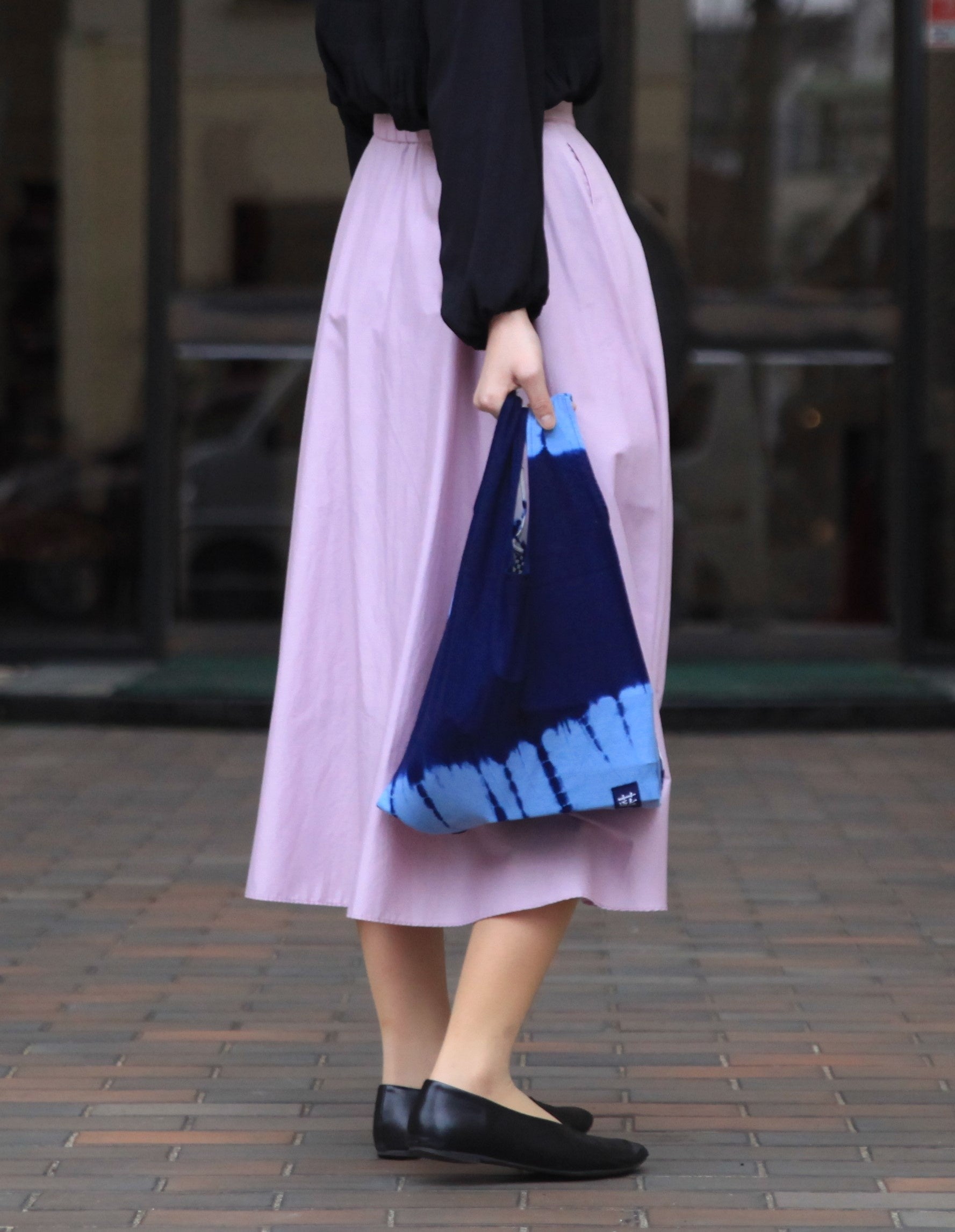 伝統的な藍染を日常のアイテムに落とし込んだ、”かいらしい”藍の袋。もともとは大きな一枚の風呂敷であった商品を、リメイクして出来上がりました。染色技法の一つである『絞り』独特の風合いが特徴で、一つ一つの柄や色の出方が異なる唯一無二の商品です。和柄のゴムで、くるっと巻いてポケットサイズで持ち運べます。