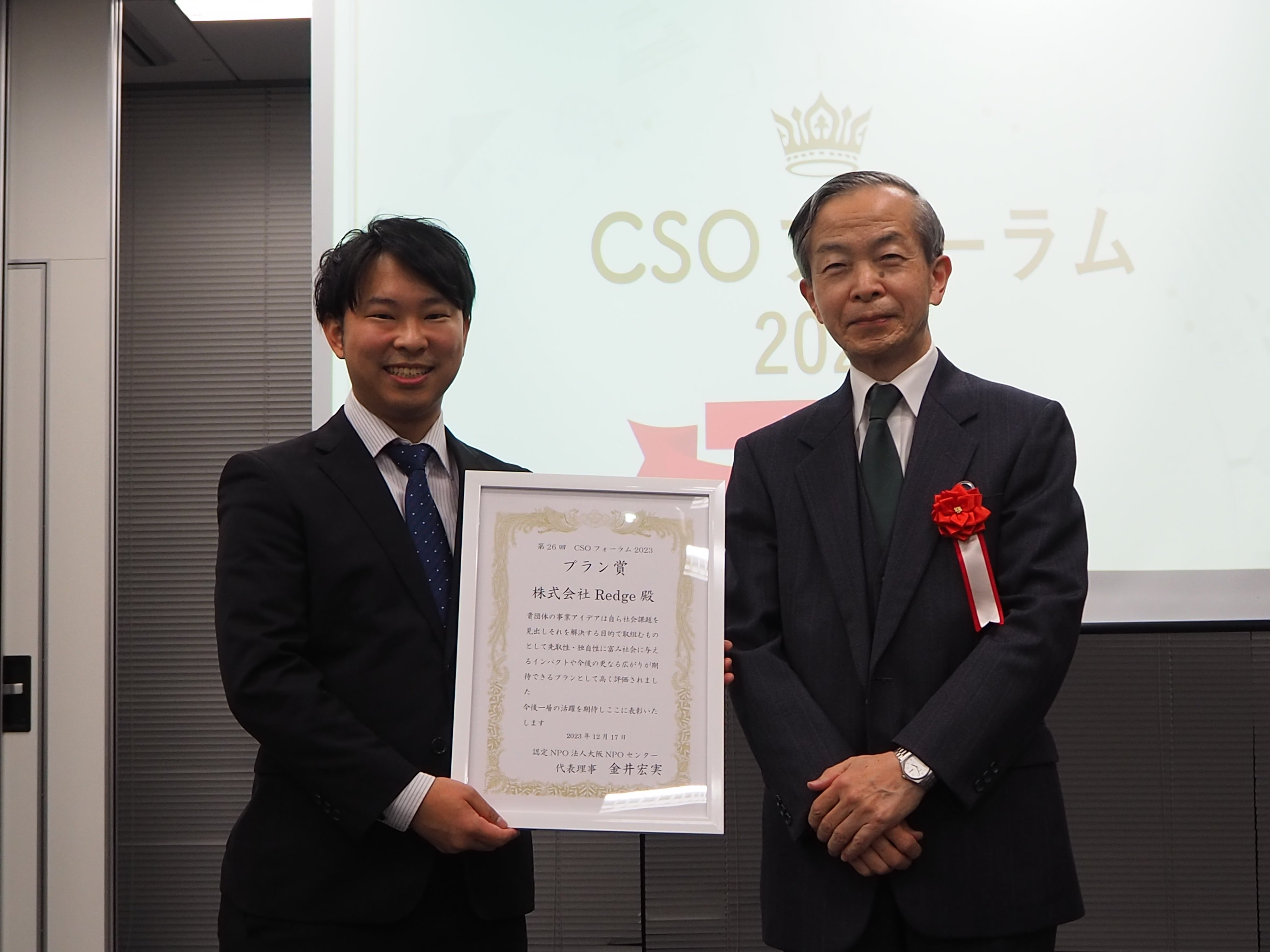 株式会社Redge(代表取締役:稲垣大輔、以下Regde (読み;レッジ))は、2023年12月17日(日)に開催された第26回CSOフォーラム2023 最終選考会にて 「プラン賞」を受賞しました。
