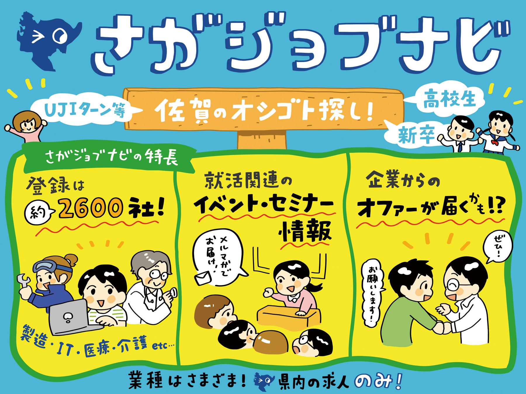 「佐賀で仕事を見つけたいけど、情報がどこにあるのかわからない」「進学でやってきた佐賀で働くならどんな企業があるの?」「佐賀で働くイメージを具体的にしたい」・・「さがジョブナビ」はそんな声から立ち上がった佐賀に特化した就職情報サイトです。県内の採用情報や就職イベントの情報など、就職に役立つ情報を掲載しています。 (サイトURL:https://saga-job.jp/)