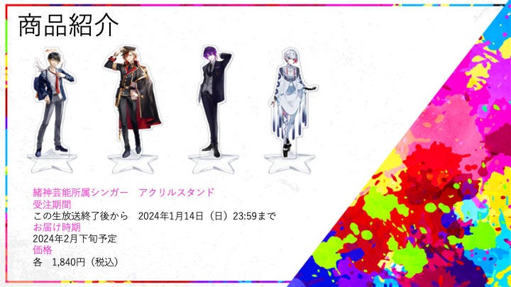 さらに新グッズ第一弾として、全10人のメンバーの等身イラストをフィーチャーしたアクリルスタンドを受注販売いたします。受注期間は2024年1月14日(日)まで、お届け予定は2月下旬となっています。