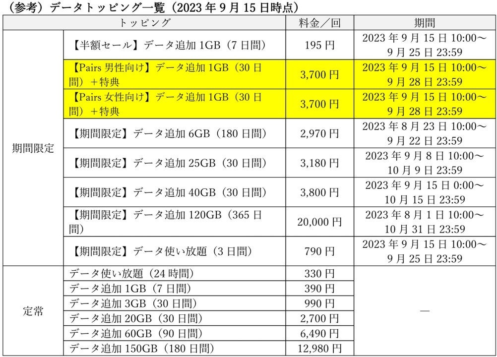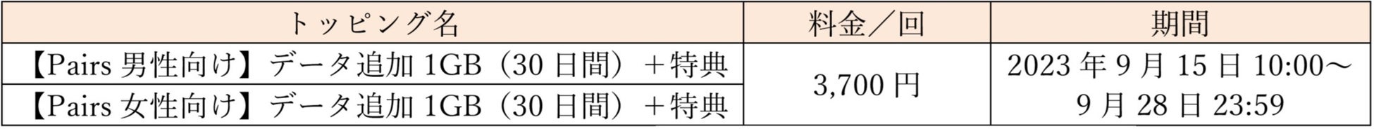 Pairs「有料会員プラン」1カ月分(3,700円相当)のデジタルコードとpovo2.0「データ追加1GB(30日)」(499円相当)(注)がセットで3,700円と、別々でお求めいただくより499円おトクです。