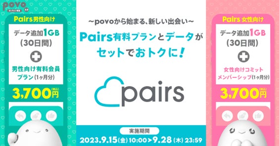 povo2.0、恋活・婚活マッチングアプリ「Pairs」がセットのデータトッピングを9月28日まで提供