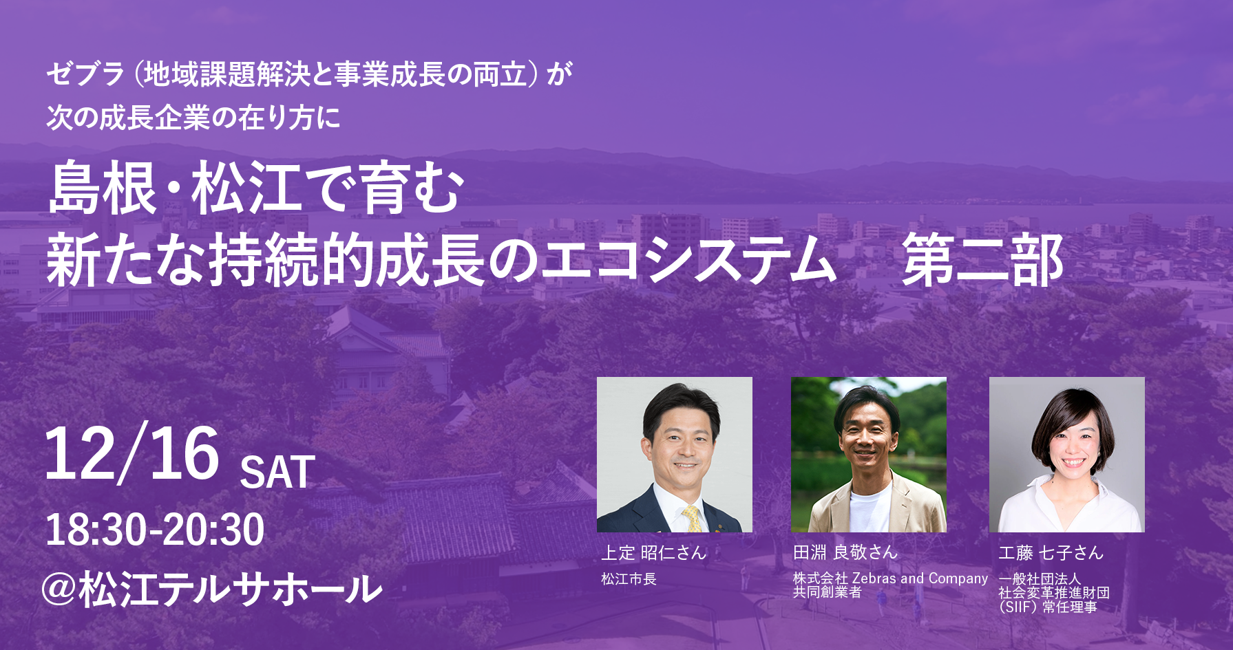 今回のイベントでは、そのようなゼブラ企業というキーワードを切り口として「島根・松江で育む新たな持続的成長のエコシステム」をテーマに2部構成でセッションを行います。
