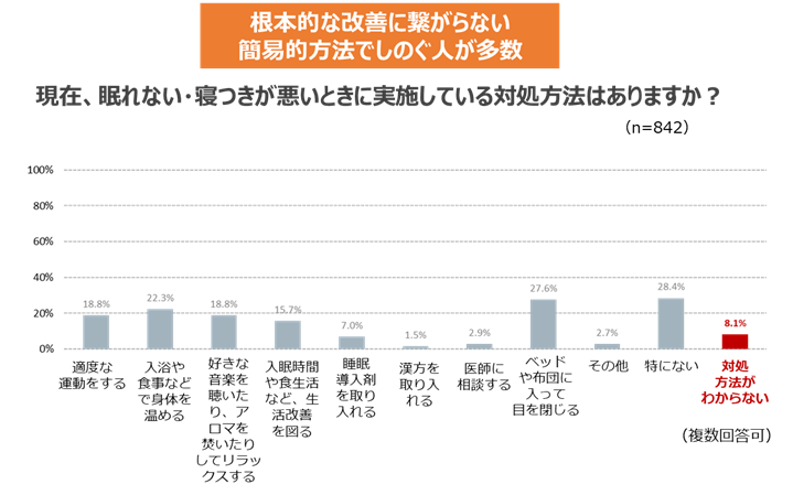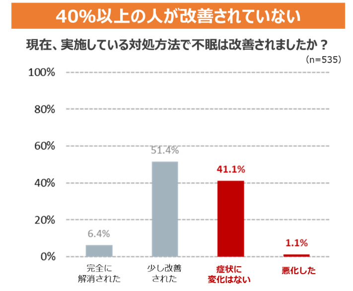 40%以上が「現在の対処方法で不眠は改善していない」と回答。より根本的な原因を探ることが重要に。