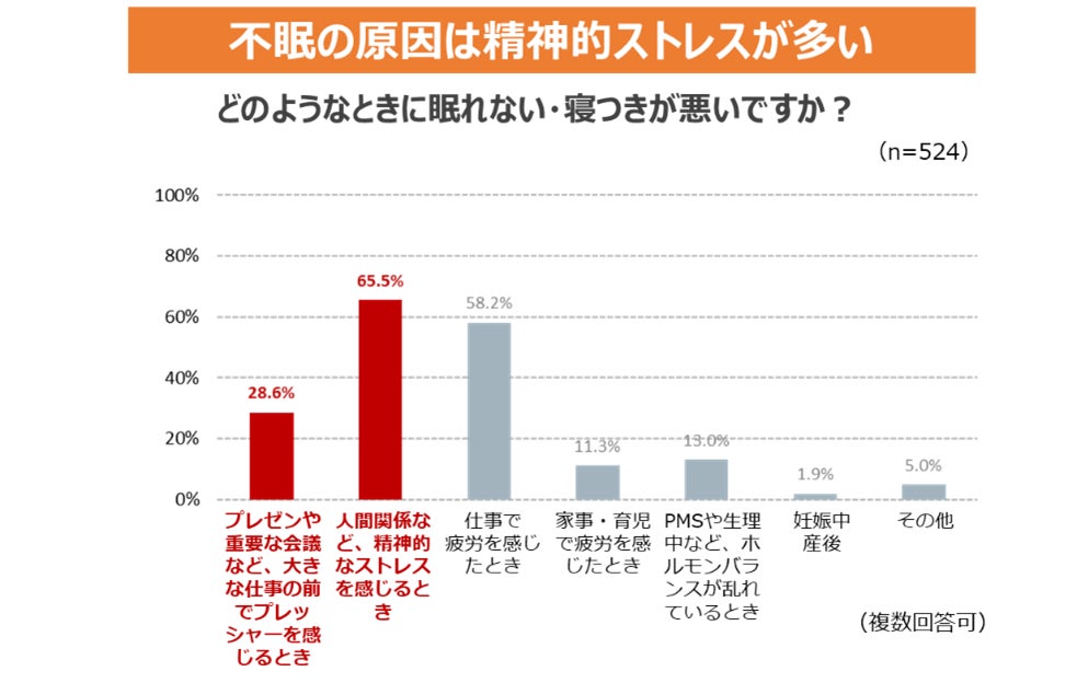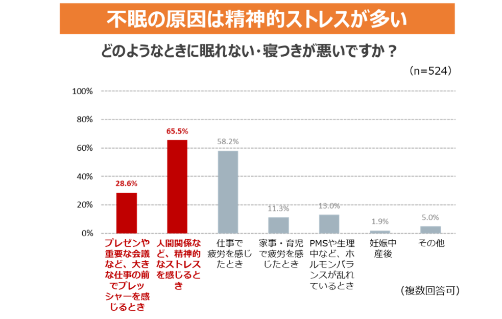 「どのようなときに眠れない・寝付きが悪いですか?」という質問に対して、「人間関係など、精神的なストレスを感じるとき」と答えた人が60%以上おり、「プレゼンや重要な会議など、大きな仕事の前でプレッシャーを感じるとき」と答えた人も30%近くいることが判明しました。不眠の原因は精神的なストレスが理由の場合が多いことがうかがえます。