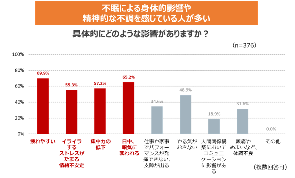「具体的にどのような影響がありますか?」という問いに対しては、「疲れやすい」「眠気に襲われる」「集中力の低下」「イライラする」などが上位を占める結果に。不眠による身体的影響や精神的な不調で悩んでいる人が多いことが示唆されます。