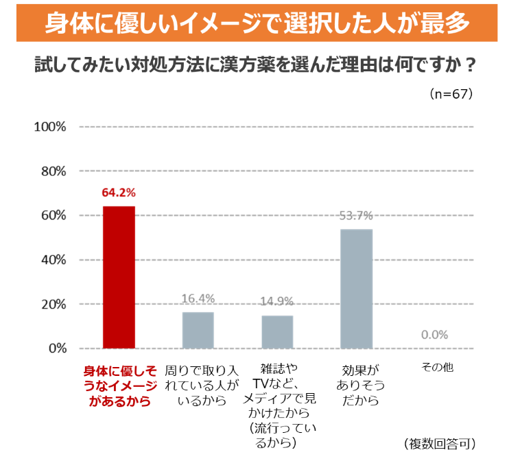 また、8%の人が「漢方を取り入れる」と回答。「試してみたい対処方法に漢方薬を選んだ理由は何ですか?」と伺ったところ、「身体に優しそうなイメージがあるから」と答えた人が最も多く、身体に負担のない対処法を重視していることがうかがえます。