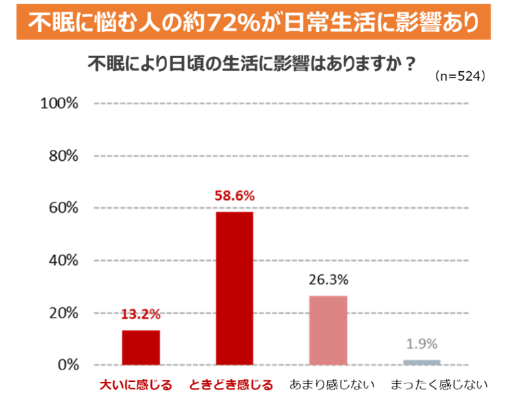 不眠に悩む人の約72%が日常生活に影響を感じていると回答。「疲れやすい」「眠気に襲われる」「集中力の低下」「イライラする」などの症状が上位にランクイン。