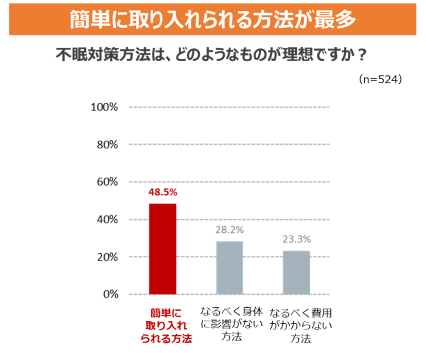 不眠に悩む人の半数近くが、理想の不眠対策として「簡単に取り入れられるもの」を選ぶ結果に。費用面よりも利便性や手軽さが重要視されていることが判明。