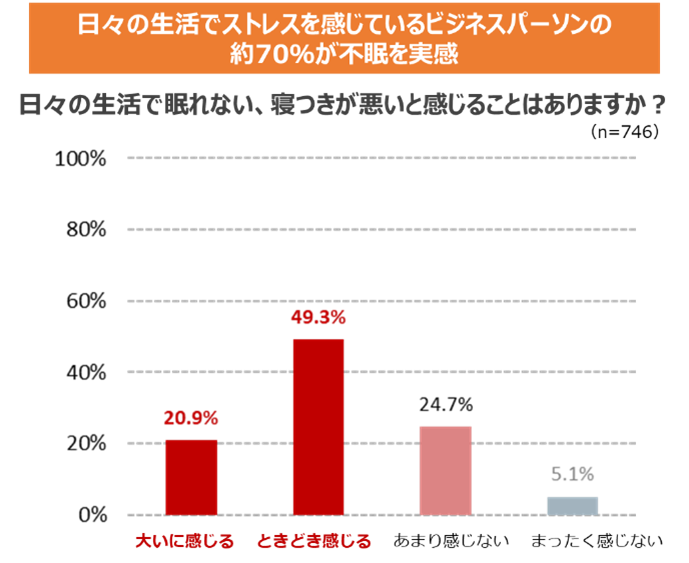 日々の生活でストレスを感じているビジネスパーソンの約70%が「眠れない・寝付きが悪いと感じることがある」と回答。日々のストレスが睡眠の質に影響を及ぼす可能性あり。