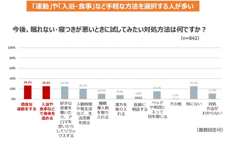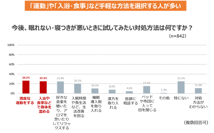 眠れない・寝付きが悪いときに試したい対処方法として、半数以上が手軽に始めることができる「適度な運動」や「入浴・食事」を選択。