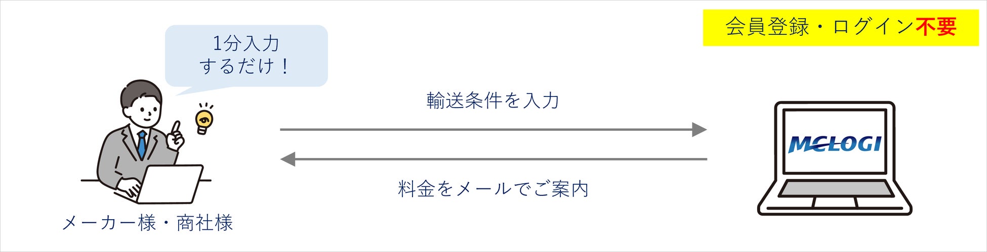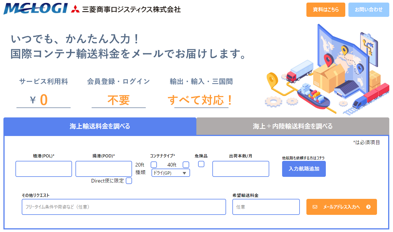 サービスページ上で航路・コンテナタイプなどをご入力いただくだけで、いつでも・かんたんに物流費を確認できるWeb見積りサービスです。入力は1分で完了、会員登録・ログイン不要、さらに利用料は完全無料です。