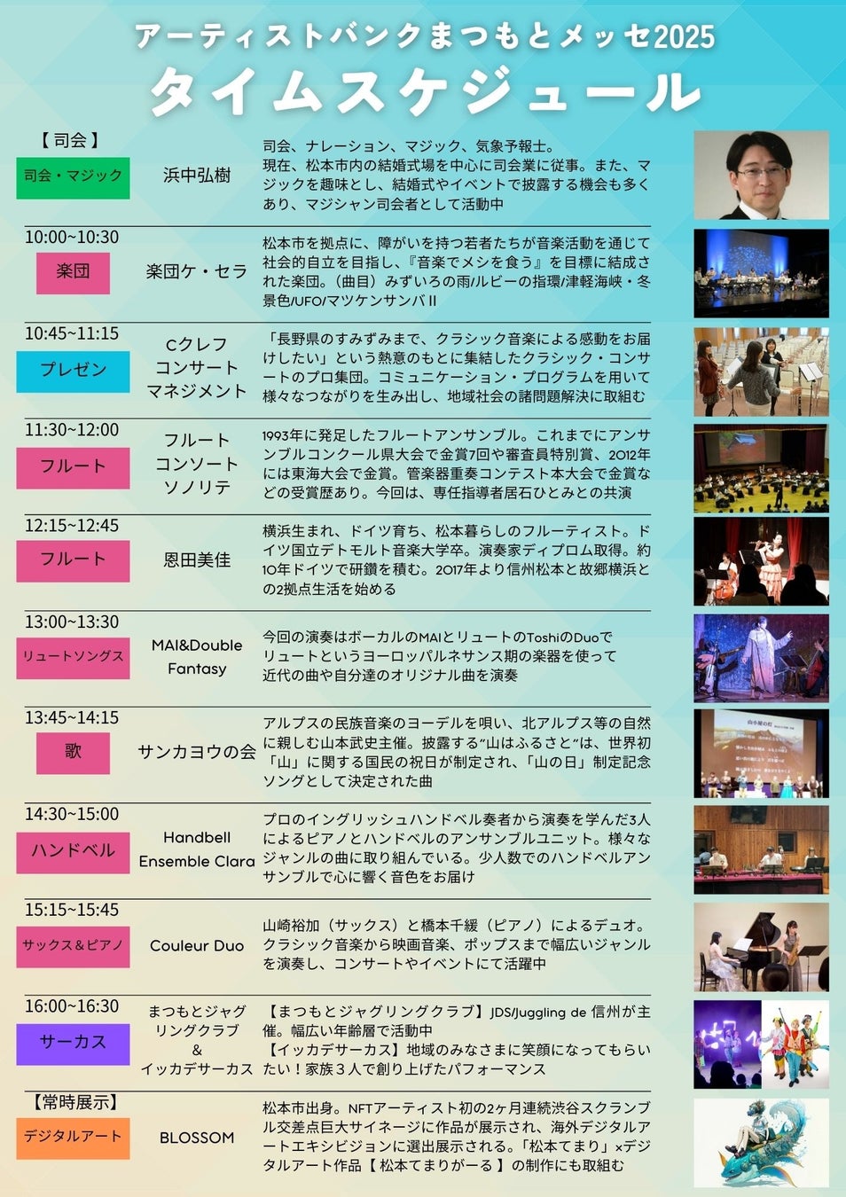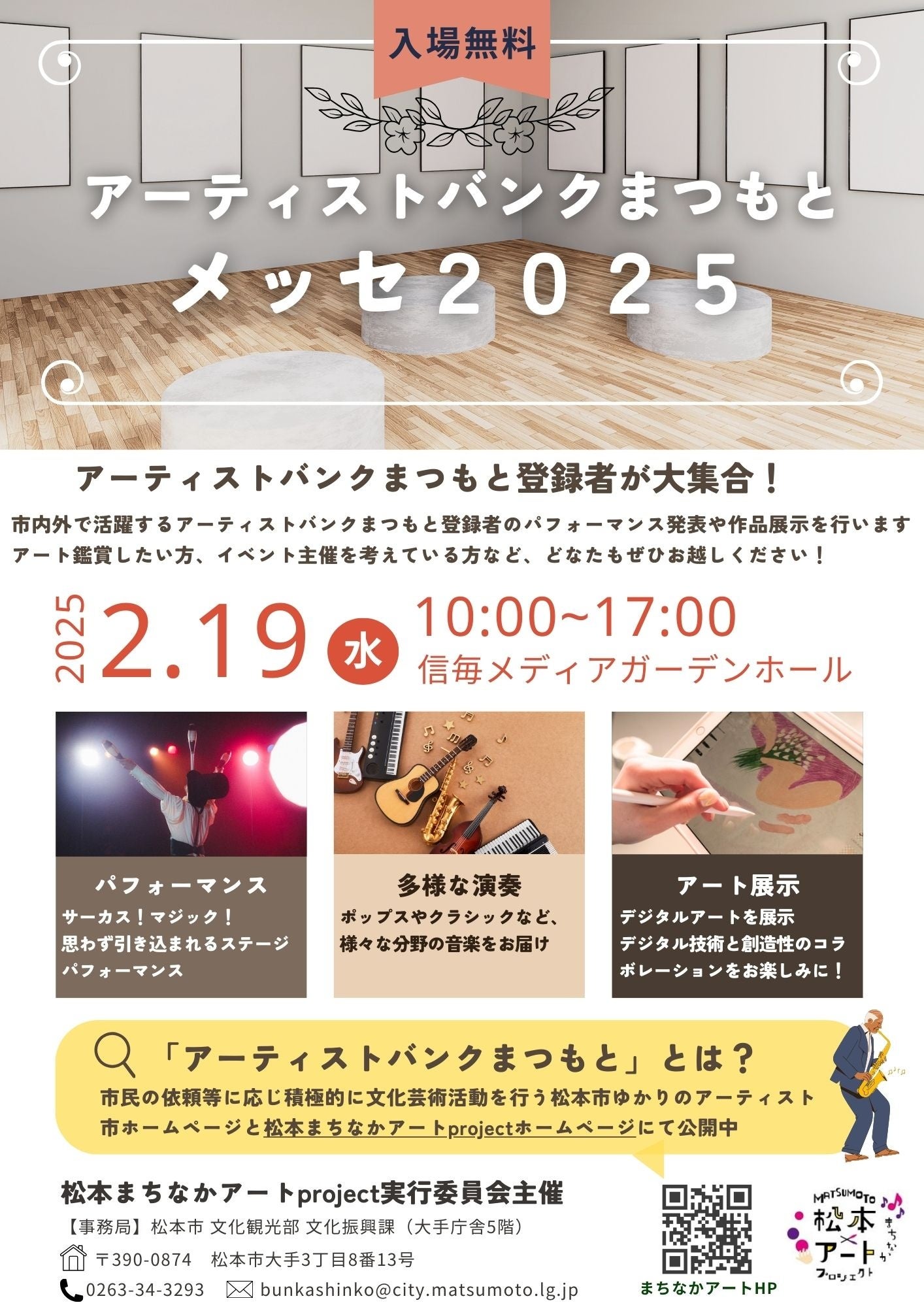 市内外で活躍するアーティストバンクまつもと登録者のパフォーマンス発表や作品展示を行います。アート鑑賞したい方、イベント主催を考えている方など、どなたでもぜひお越しください!