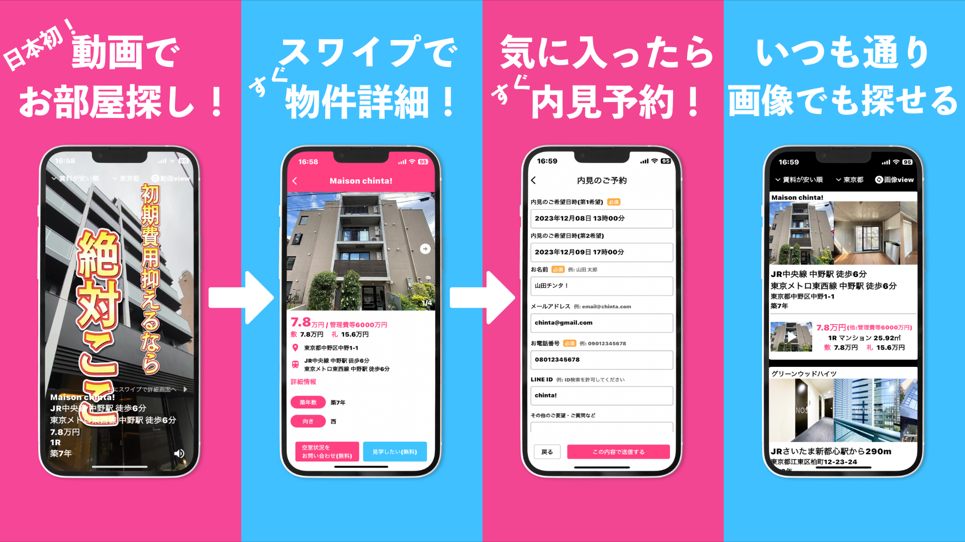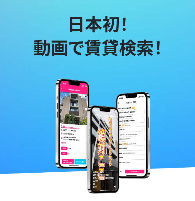 chinta!では、「楽しくお部屋探しをしてすぐに問い合わせをしたい」というニーズに応え、動画閲覧〜詳細確認~お問い合わせを迅速にご案内します。