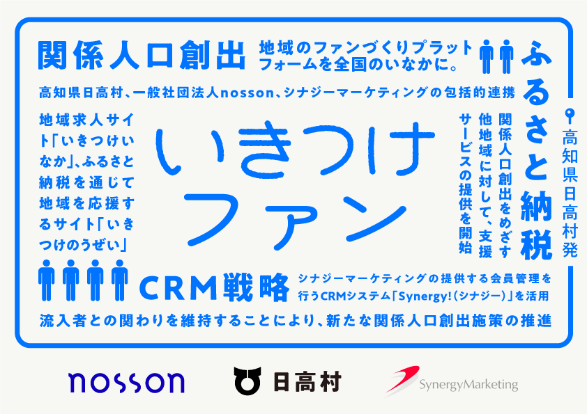 三者は包括的連携のもと、nossonの提供する地域求人サイト「いきつけいなか」、ふるさと納税を通じて地域を応援するサイト「いきつけのうぜい」、シナジーマーケティングの提供する両サイトの会員管理を行うクラウド型CRM(総合顧客管理)システム「Synergy!(シナジー)」を活用し、上記サイトからの流入者との関わりを維持することにより、移住やふるさと納税といった新たな関係人口創出施策の推進を行います。また、関係人口創出をめざす他地域に対して、本プラットフォームを活用した支援サービス「いきつけファン(仮称)」の提供を開始します。
