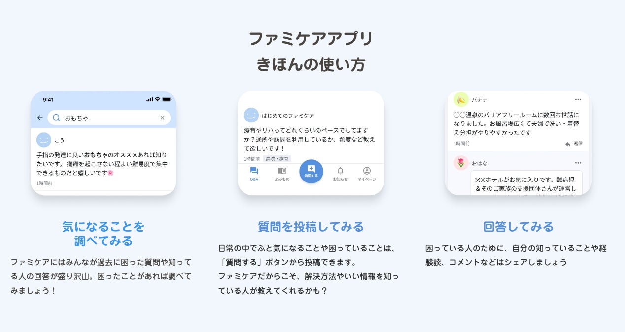 ファミケアアプリは障がいや疾患のある子どもを育てる家族のみが参加できる会員制の相談QAアプリです。質問や回答機能で「息抜きの方法は?」「お出かけ先をおしえて!」「休み方や家事分担をどうされてますか?」「育児やケアと両立しながらお仕事どうしてる?」など疾患や障がいのある子どもを育てる家族が気になる事を気軽に質問したり、発見した事を情報共有できます。