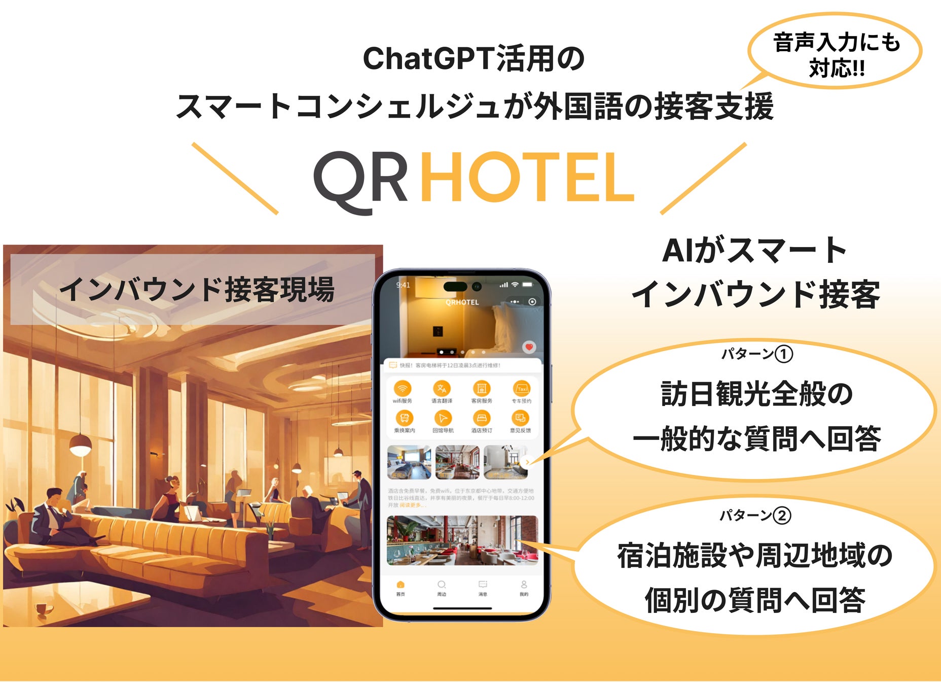 この度、QRHOTELに新開発の「次世代型AIスマート接客機能」が追加され、精度の高いAIスマートコンシェルジュが全国の宿泊施設のインバウンド接客現場のさらなる省力化に貢献いたします。