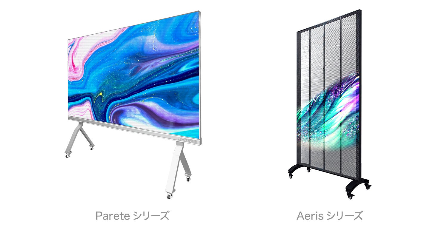 2つのキャスター付きスタンドタイプLEDビジョン製品 フルHD対応「Parete(パレーテ)シリーズ」透過型「Aeris(エアリス)シリーズ」