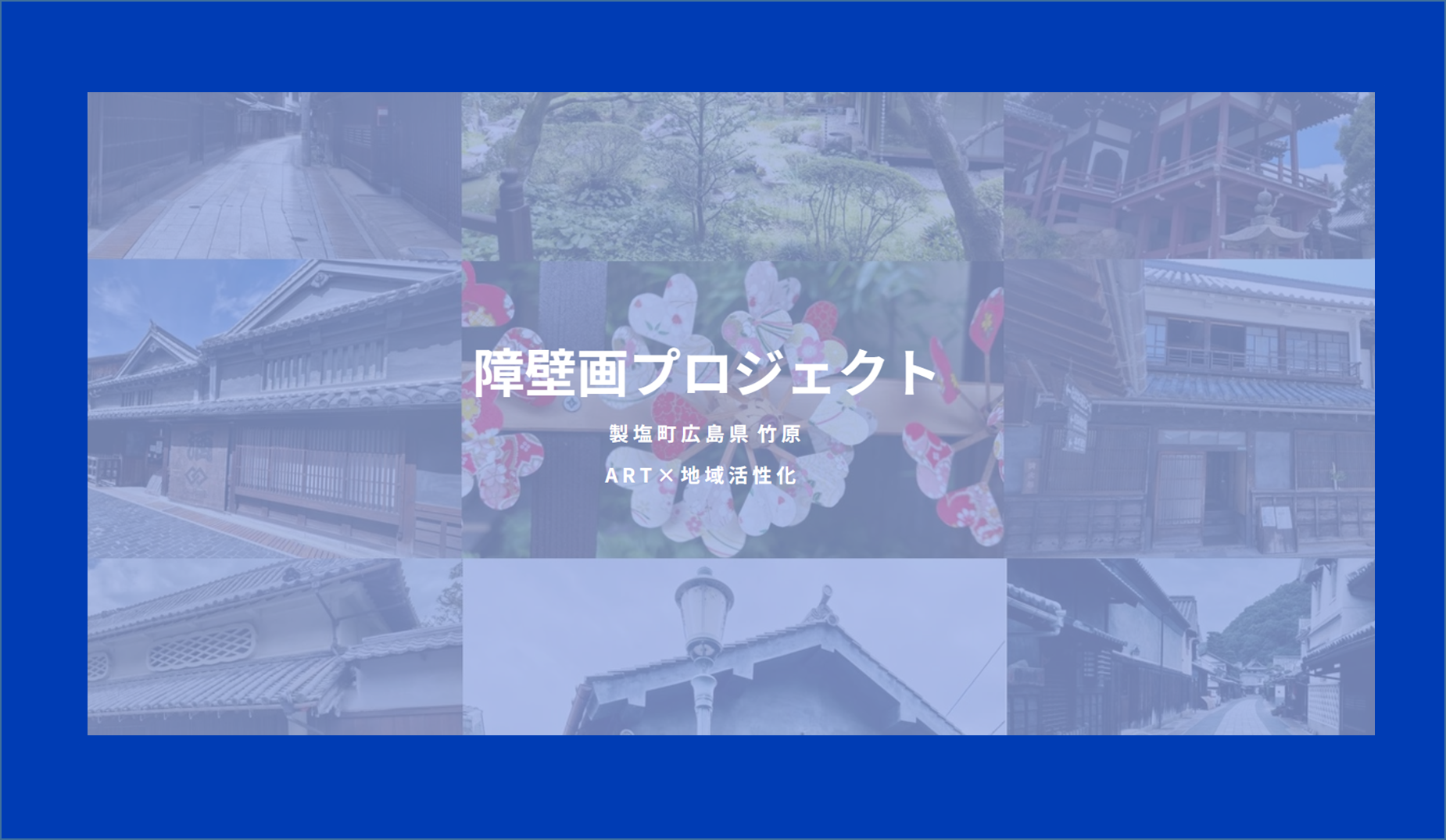 「障壁画プロジェクト」は、安芸の小京都 広島県竹原市のたけはら町並み保存地区において3名の若手アーティストの方に障壁画の滞在制作を行っていただくことにより、若手アーティストの方には新作制作・発表の機会を、地域には障壁画作品を生み出し、作品の力を原動力に地域活性化や文化財の保全に貢献するものです。