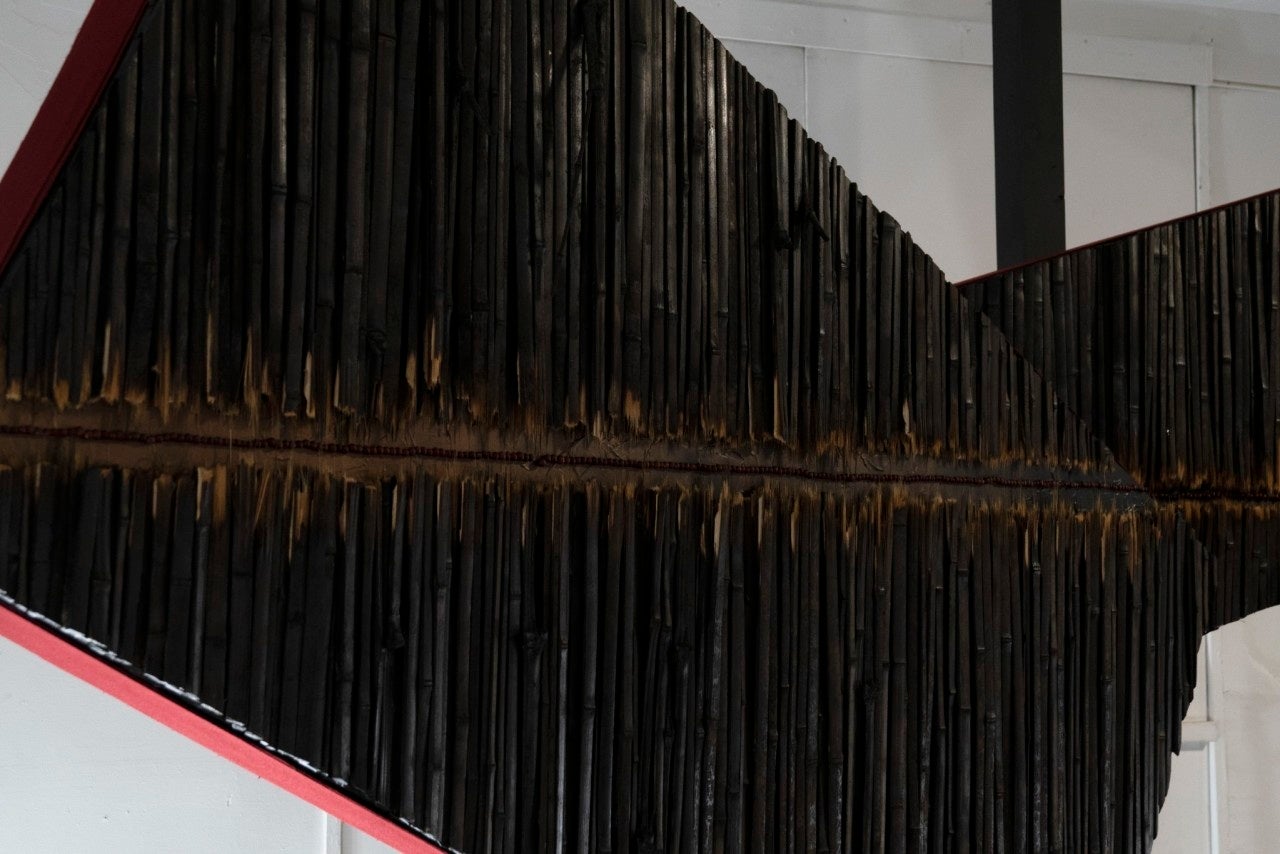 約 10.000 本の裂いた竹を焦がし割った部分の色とのコントラストを造形物として構築し たインスタレーション作品。線上に重ねた竹の間に並ぶの南天の実は、人間の松果体の高さの平均値に位置づけられている。オープニングレセプションでは、新作のパフォーミングアートも披露された。